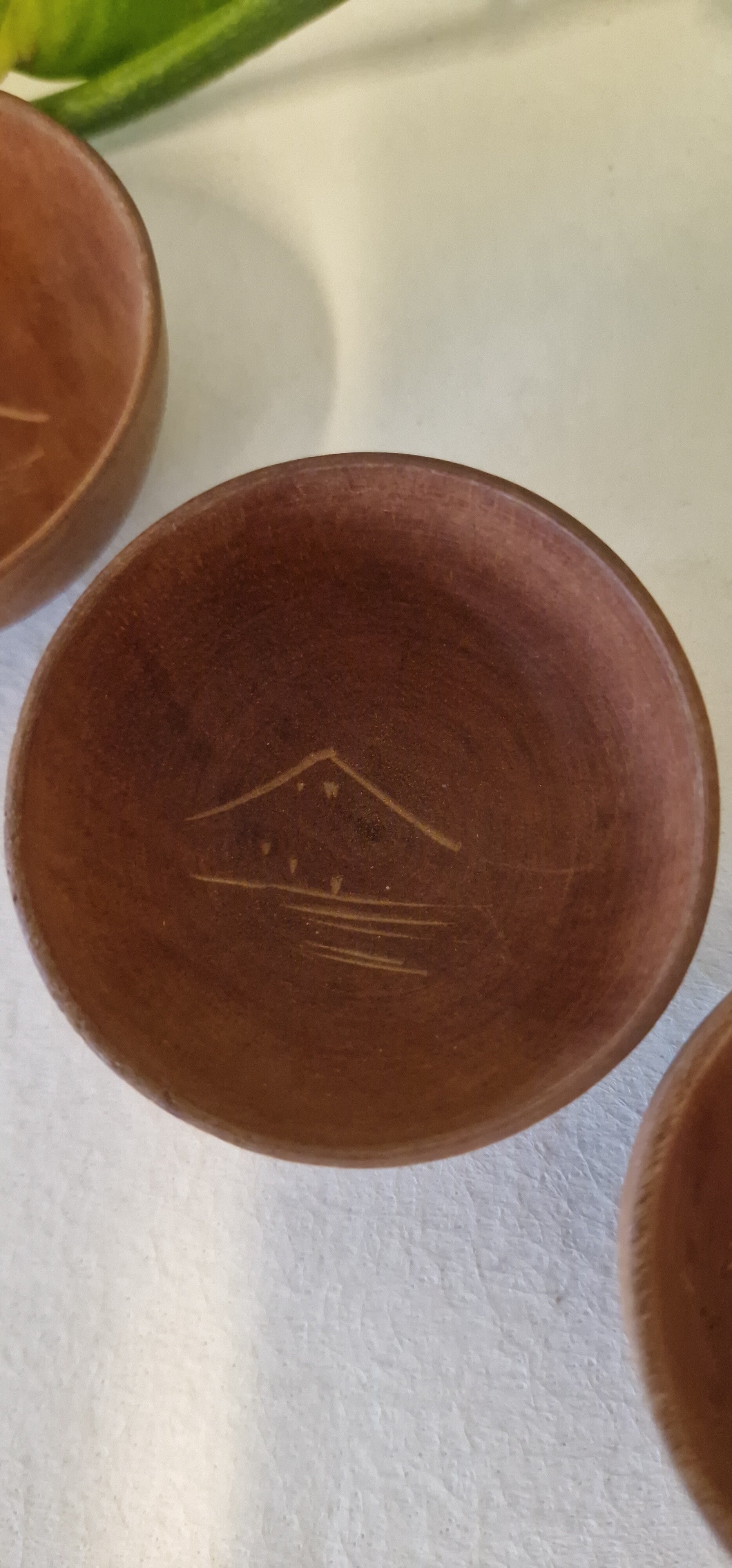 Een set van drie leuke kleien houten Japanse kommetjes met een opdruk van de berg Fuji, Japan erin geëtst.