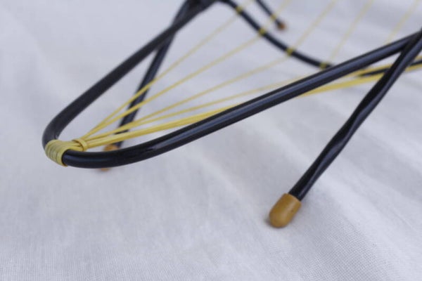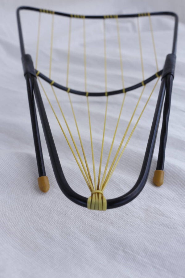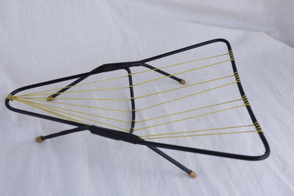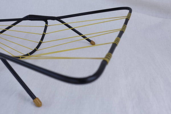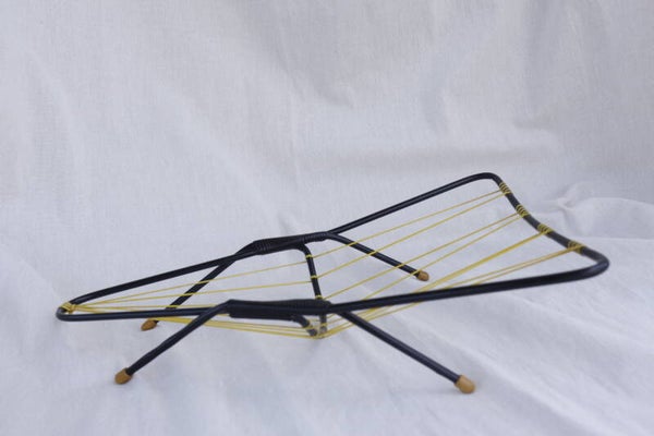 Originele vintage fruithouder uit de jaren 60, bestaand uit zwart metaal met gele scoubidou draden en witte antislipvoetjes. De draden zijn strak en sterk om het fruit goed te ondersteunen.