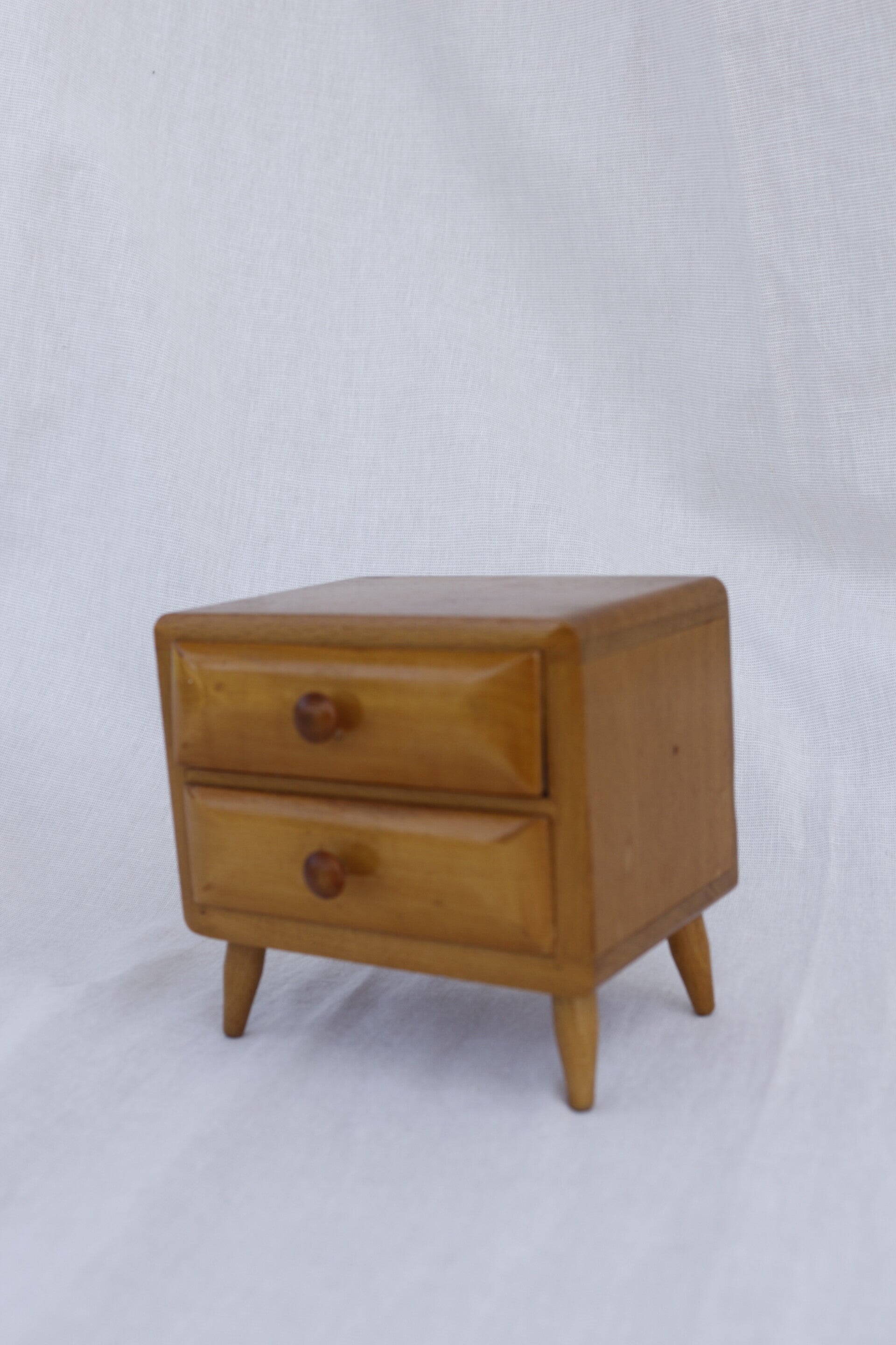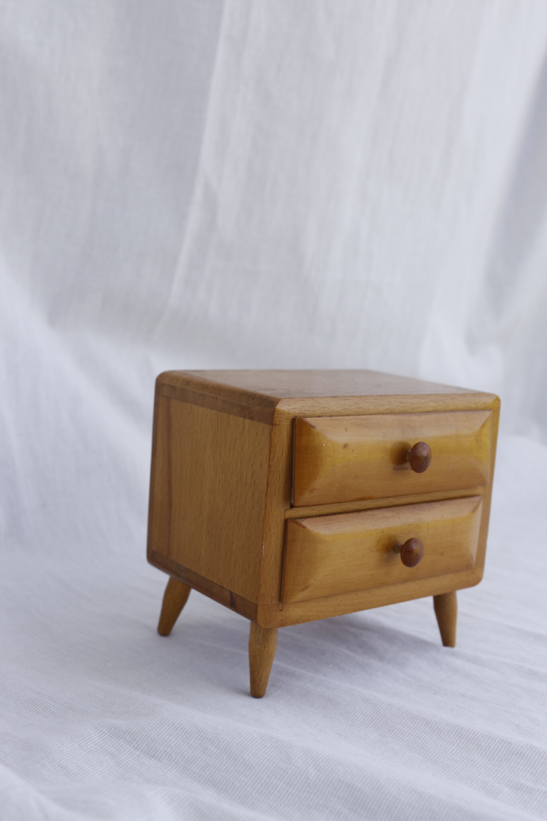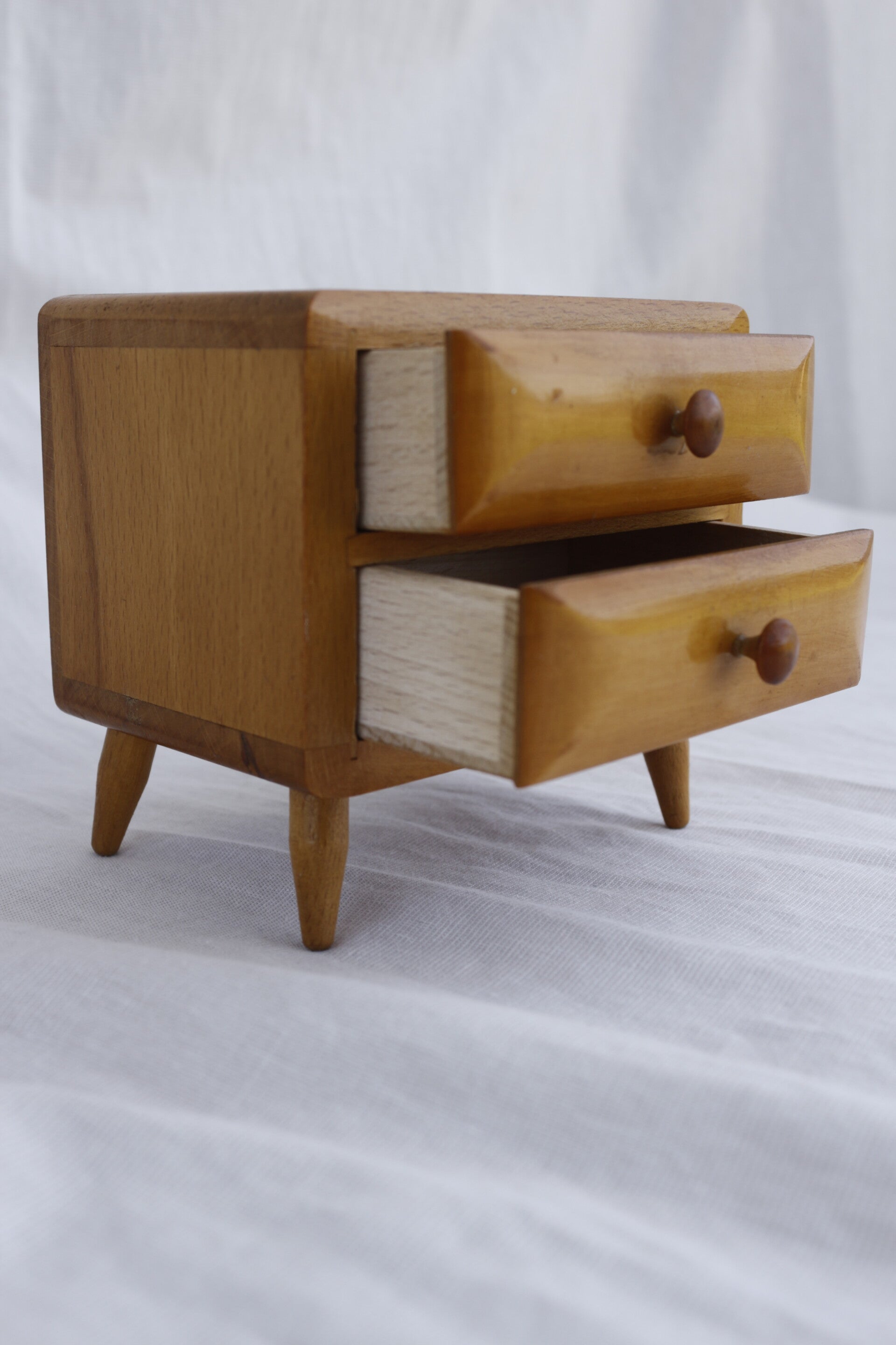 Dit handgemaakte ladekastje komt uit de jaren 50/60 en ziet er nog als nieuw uit. Het is gemaakt van massief hout. Hoort officieel in een poppenhuis, maar hoe mooi om als juwelendoosje te gebruiken.