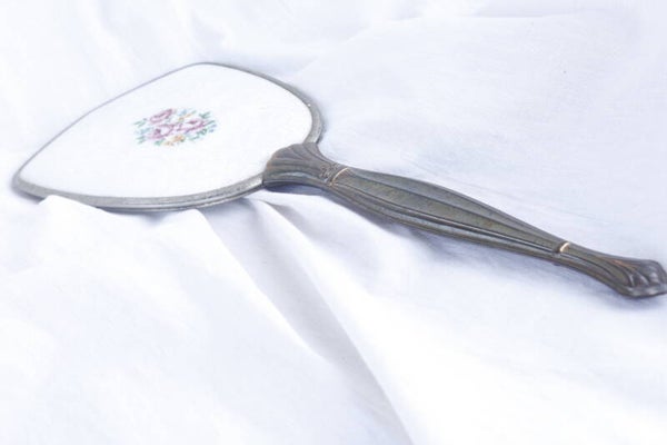 De achterkant van de spiegel is versierd met bloemen en bladeren en kant. De spiegel is aan de rand iets verweerd, maar dit stoort totaal niet.