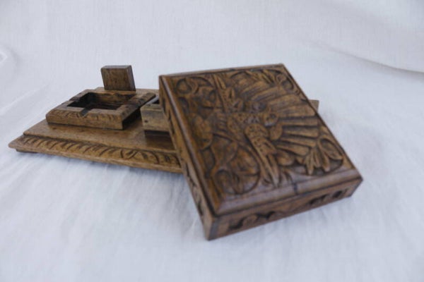 Een uit hout gesneden asbak op pootjes met een opbergbakje voor de sigaretten. Het deksel met een mooie pauwafbeelding kun je eraf halen.