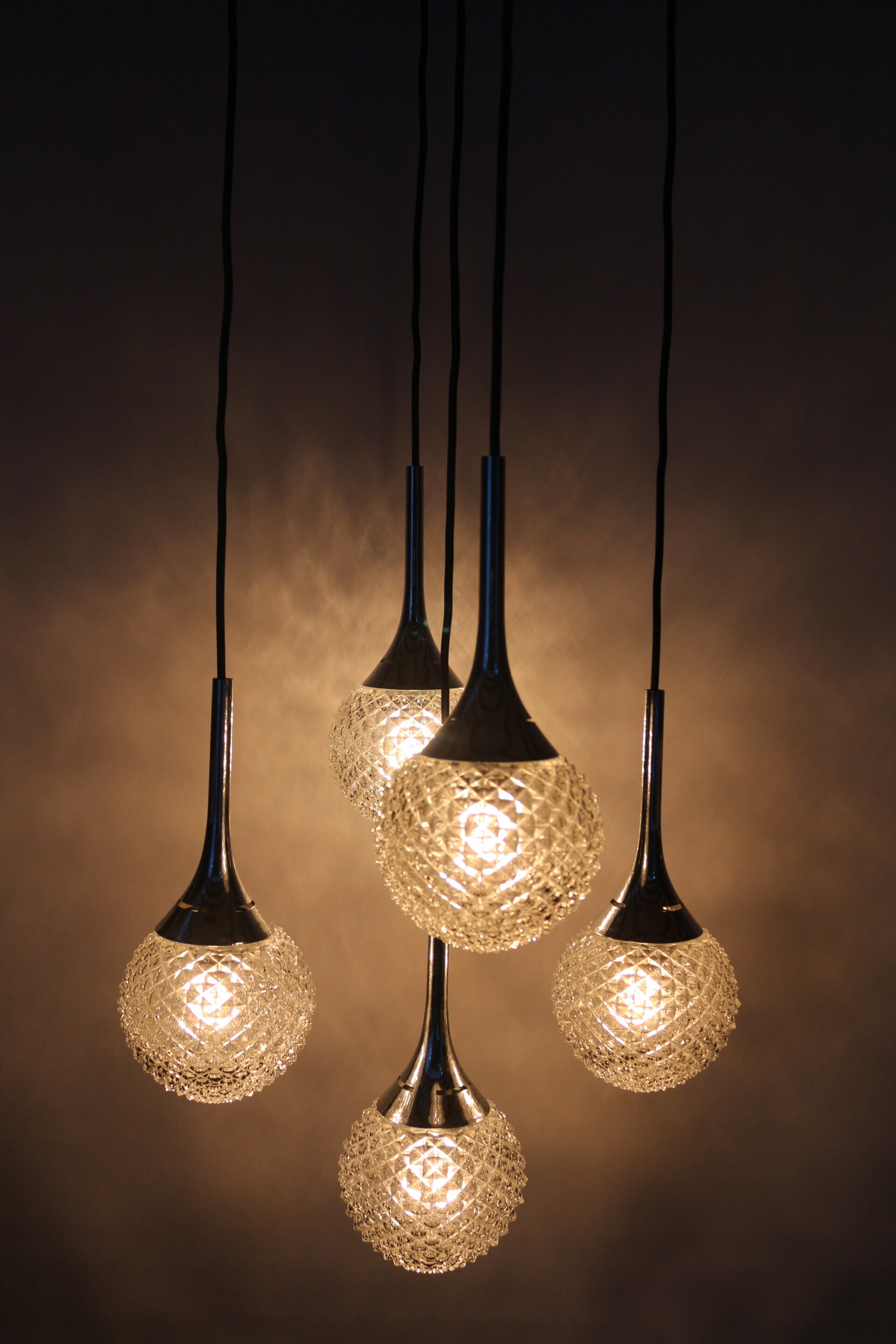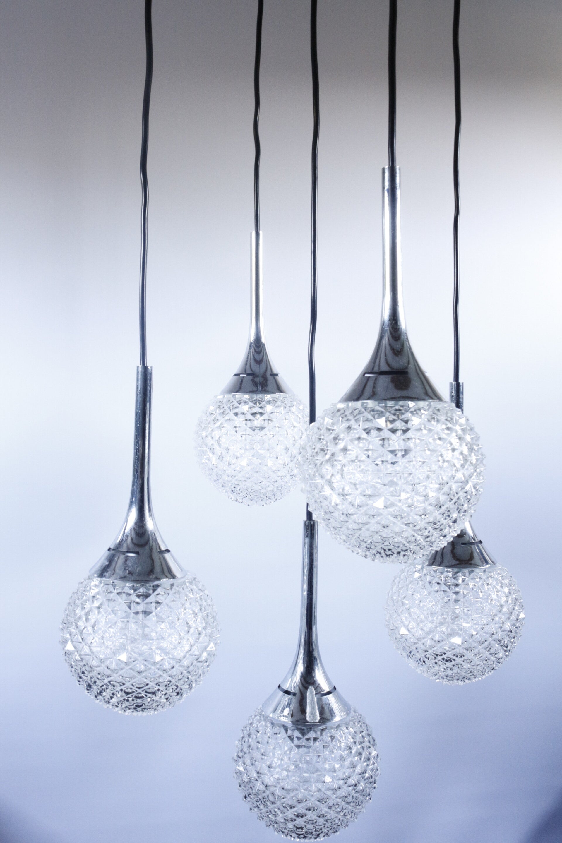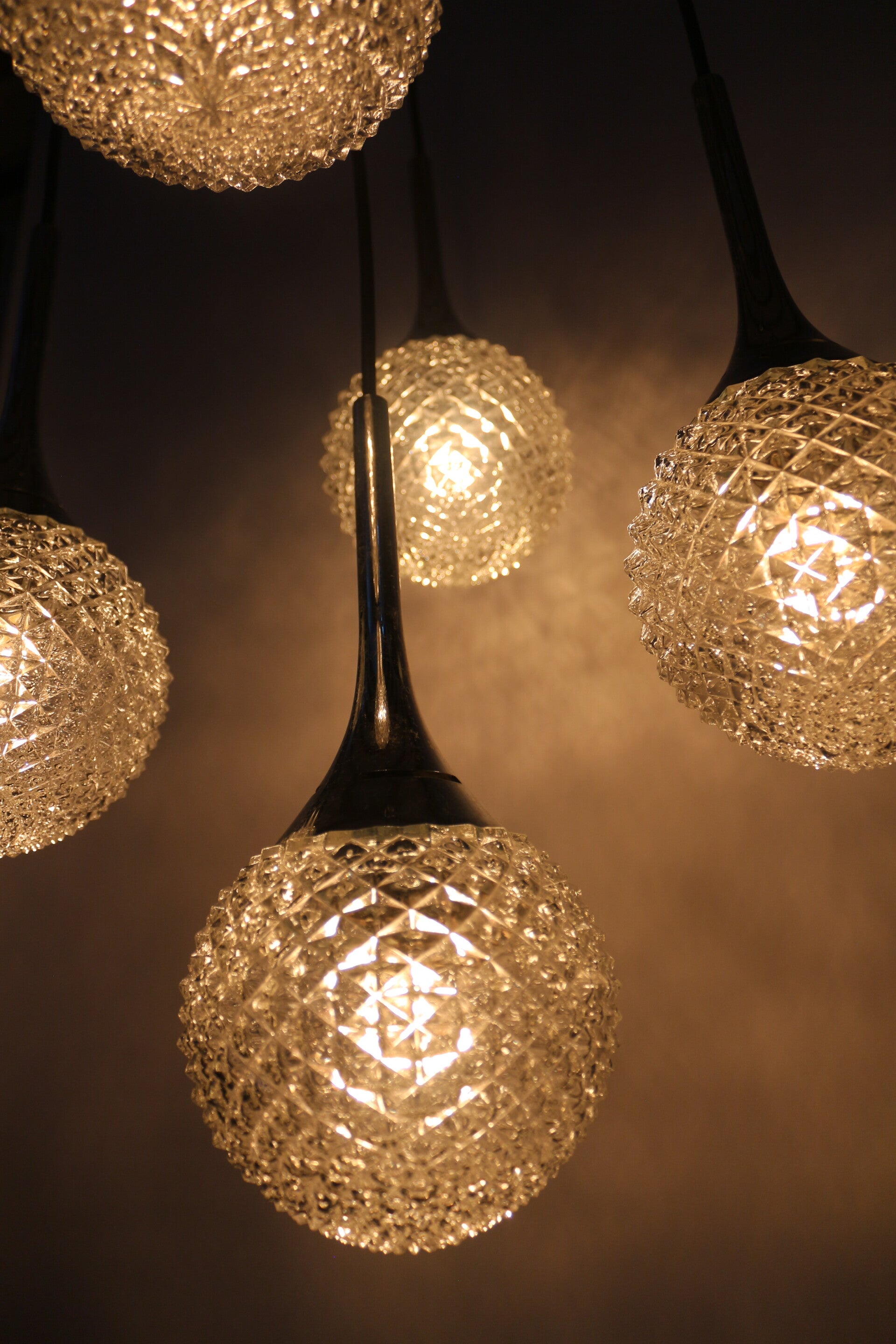 Deze mooie lamp is zowel aan als uit heel sfeervol. Hij is met glazen bollen en komt waarschijnlijk uit de jaren 60 / 70. Elke bol is bekroond met een kelk in chroomkleur.