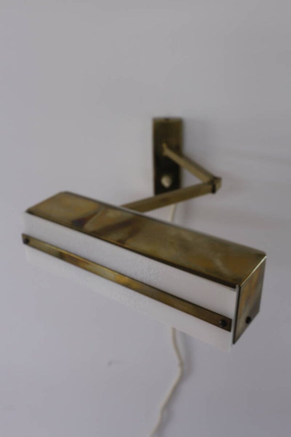 Deze mooie lamp is van Paul Neuhaus Leuchten, Duitsland. Het is een muurlamp in messing met wit hard plexiglas uit de jaren 50. Hij heeft een arm heeft die uit twee delen (beiden 15 cm) bestaat en daardoor op heel veel verschillende manieren is te gebruiken.