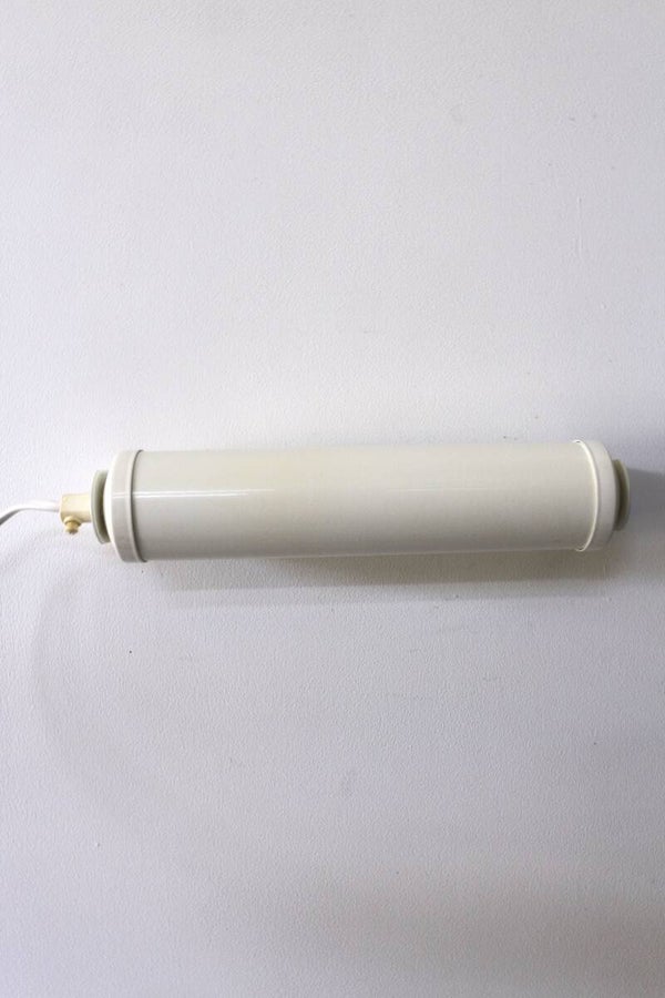 Vintage metalen bedlamp in de kleur wit met wandbevestiging en kantelbaar front, waardoor het licht naar boven of naar onderen kan schijnen. De wandlamp is perfect om te lezen in bed. De lamp is voorzien van een lang snoer met stekker en aan/uit schakelaar. Gemaakt in de jaren 80.