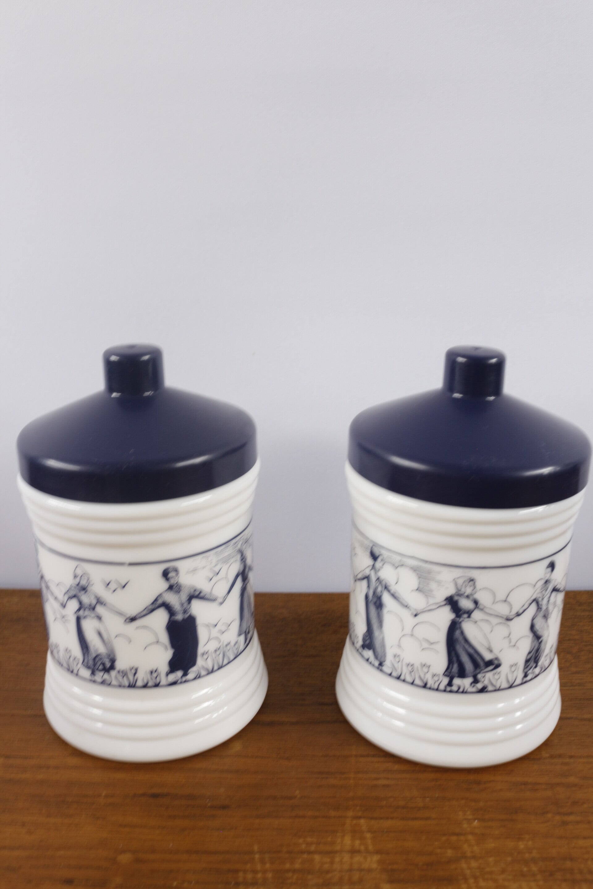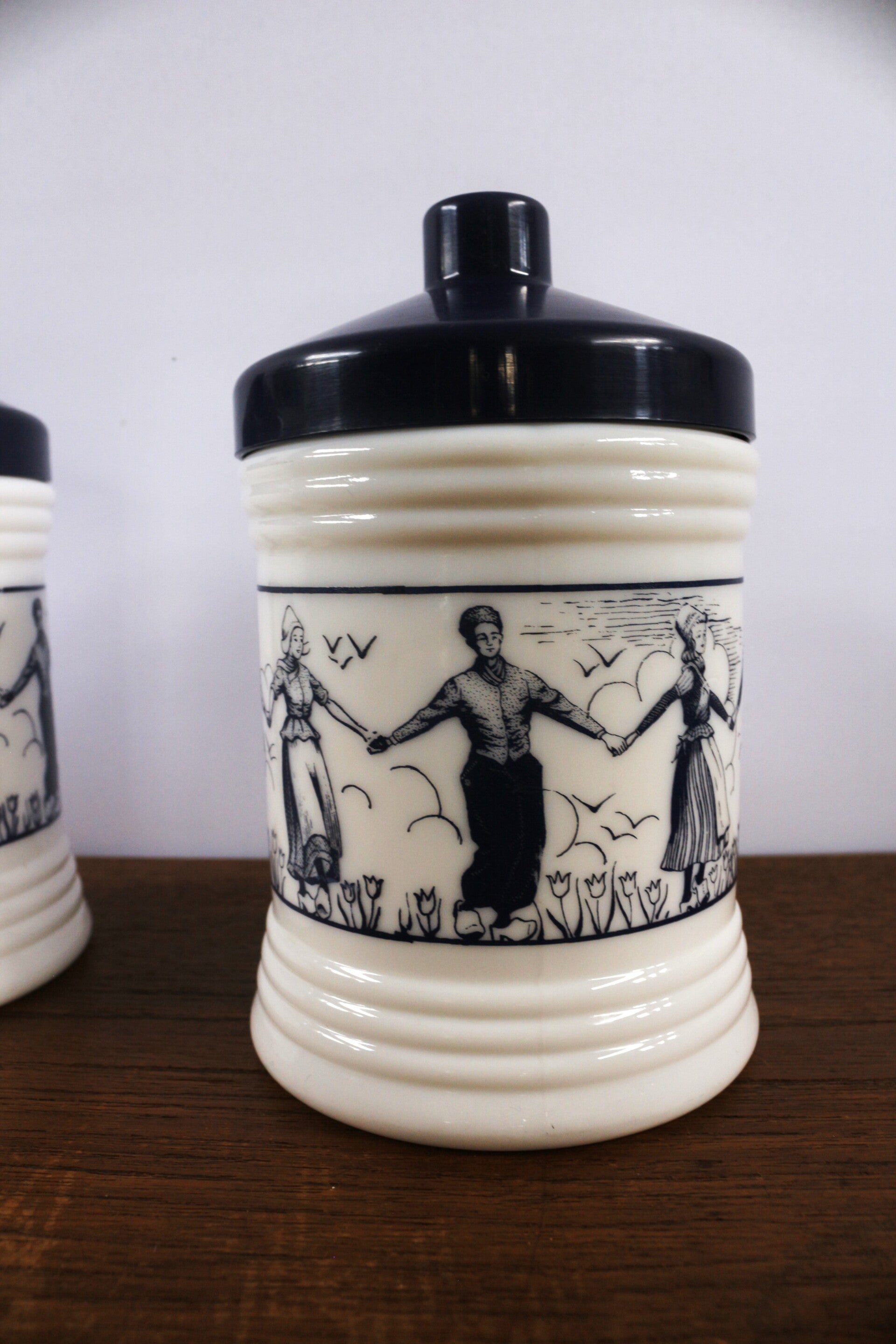 Deze vintage potten hebben een afbeelding van dansende mensen in boerenkleding. De pot gemaakt uit opaline glas is voorzien van een blauw kunststof deksel.