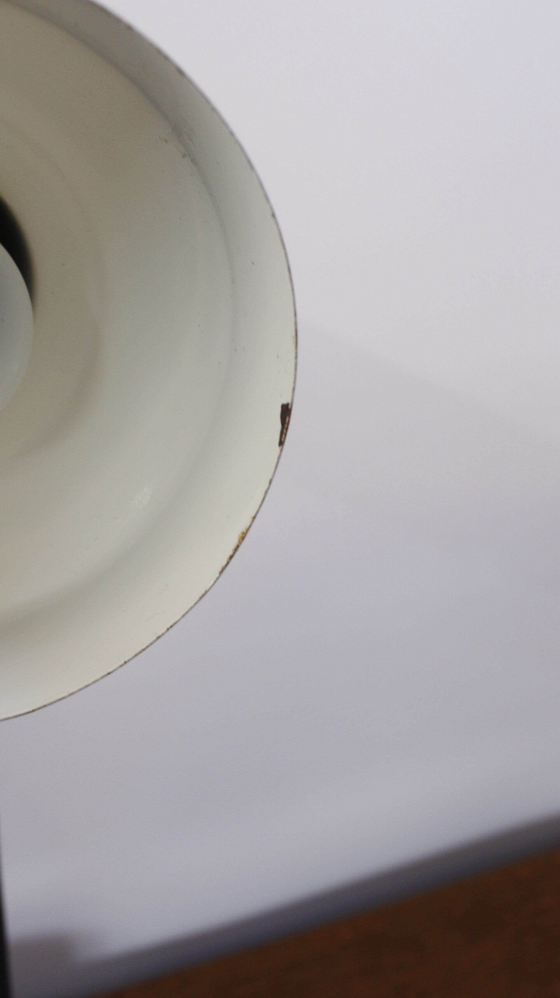 Het hoogste punt van de lamp als hij helemaal recht staat is 36 cm, doorsnede van de voet is 12.5 cm. Het lampenkapje is 15 cm lang en heeft een doorsnede van 10.5 cm. De kap heeft een kleine beschadiging, zie foto.