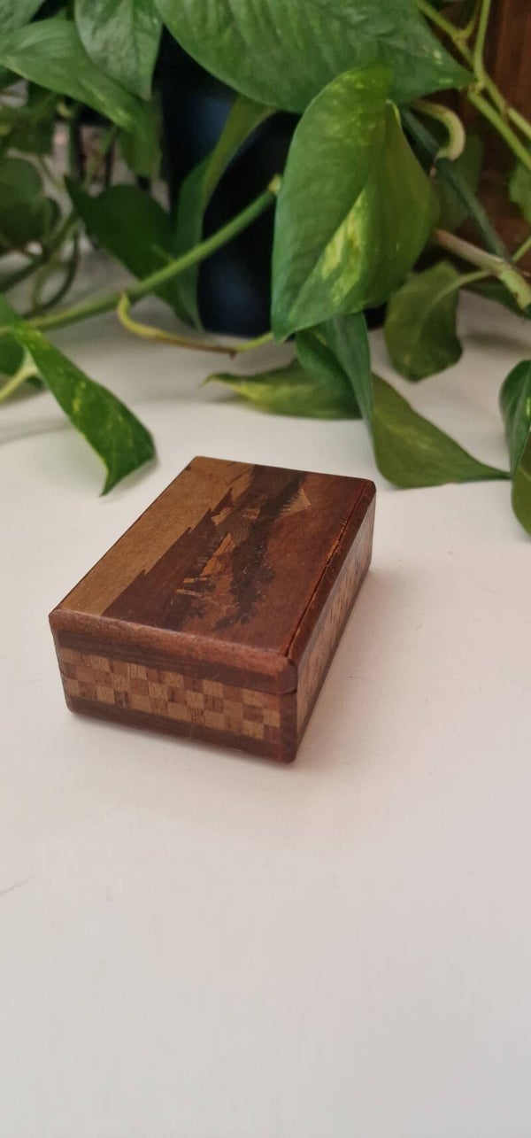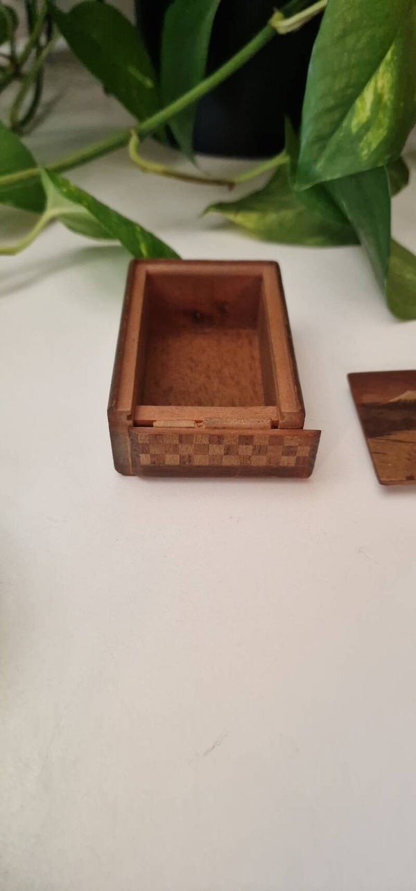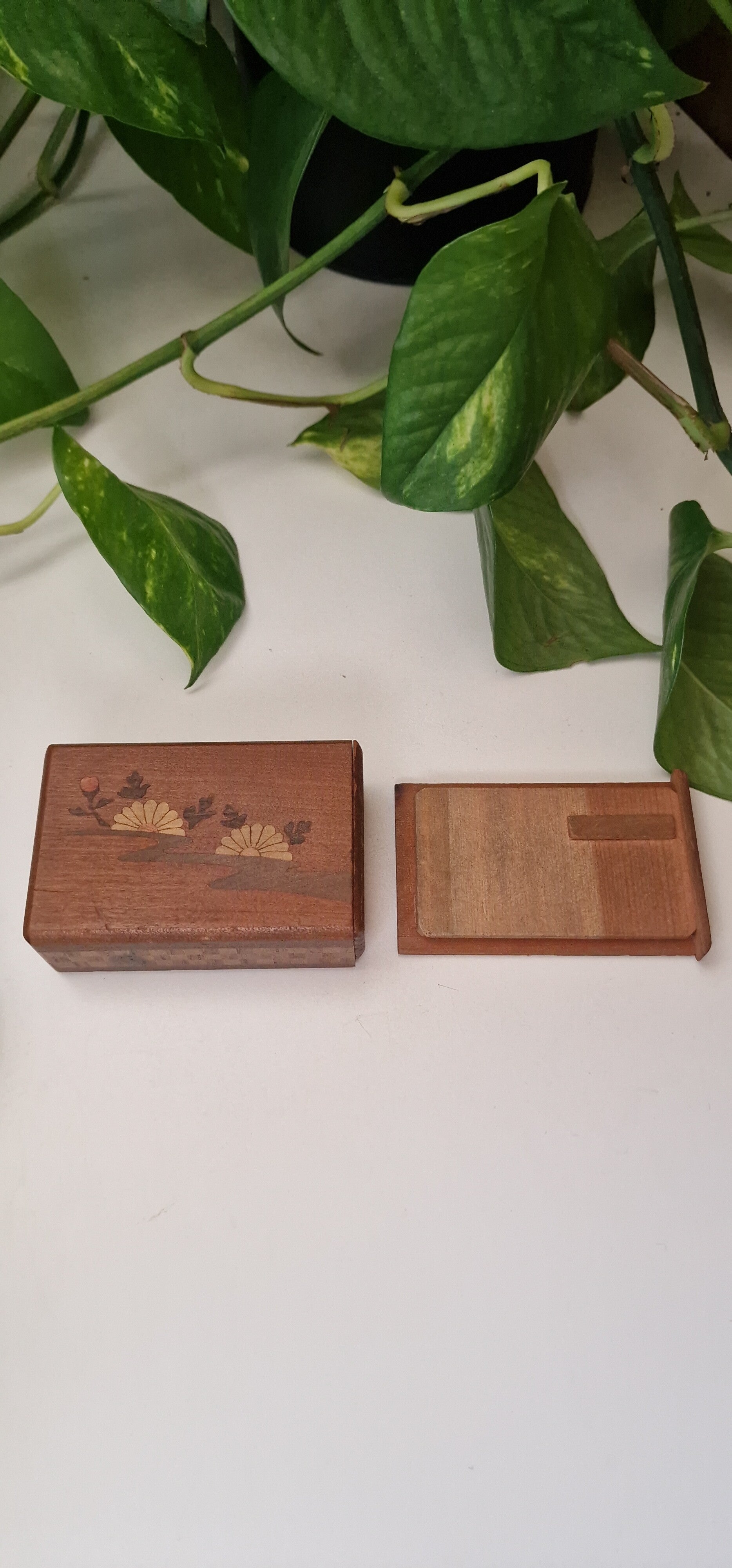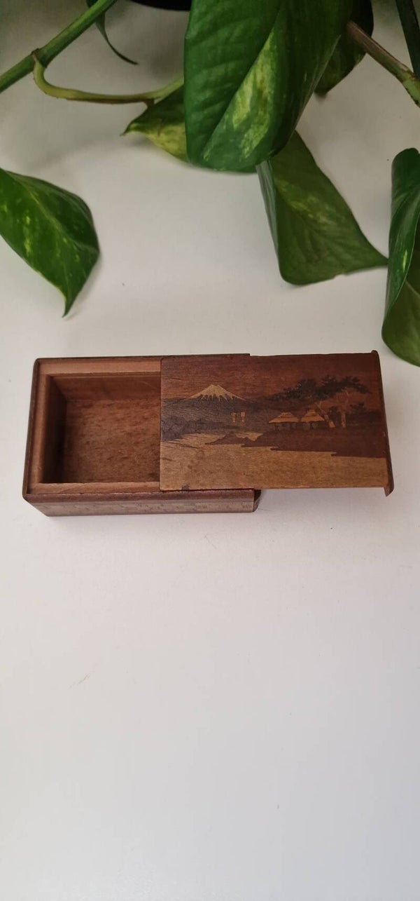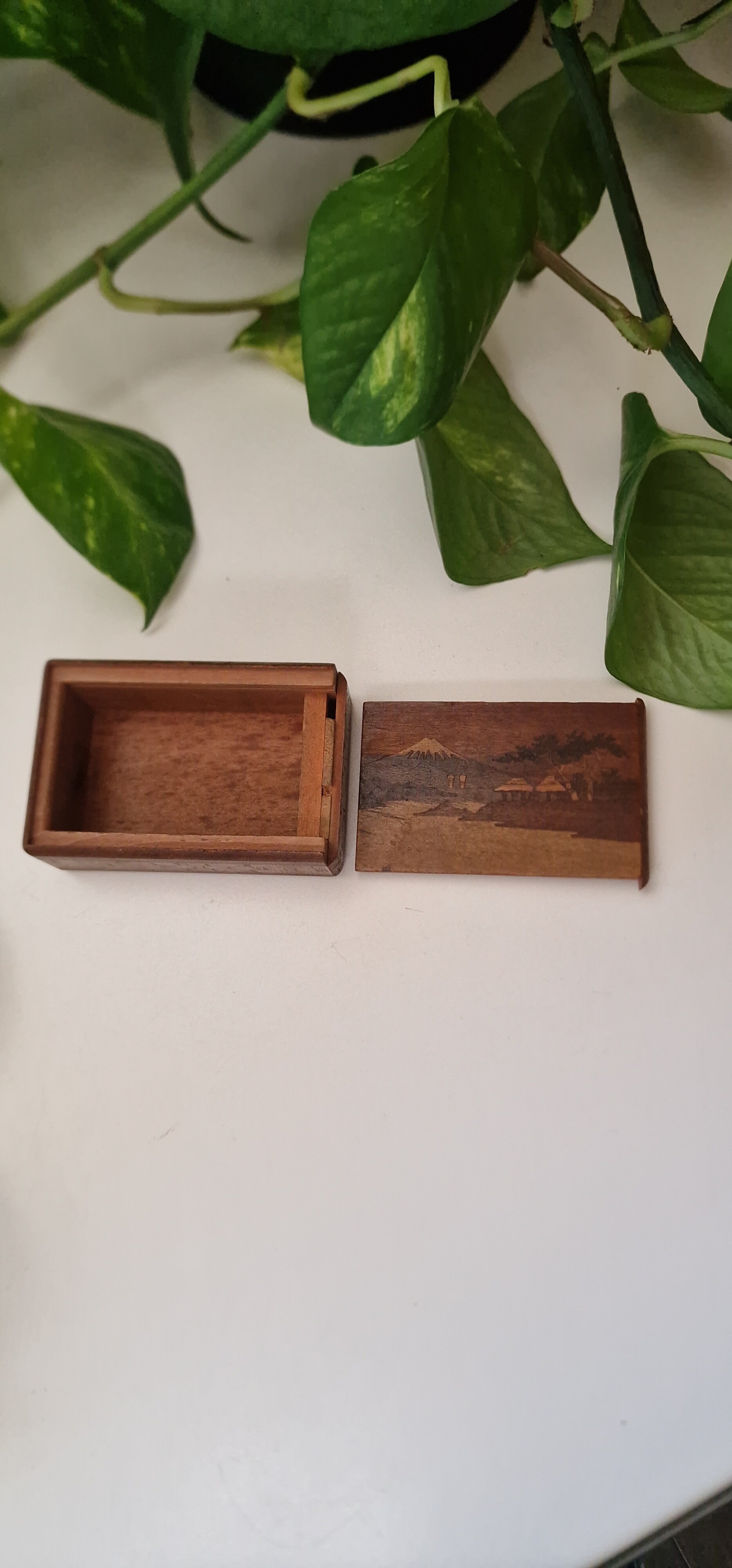 Een oud Japans houten puzzel boxje. Aan de voorzijde een schuifpaneeltje met een Japans landschap met Mount Fuji op de achtergrond.