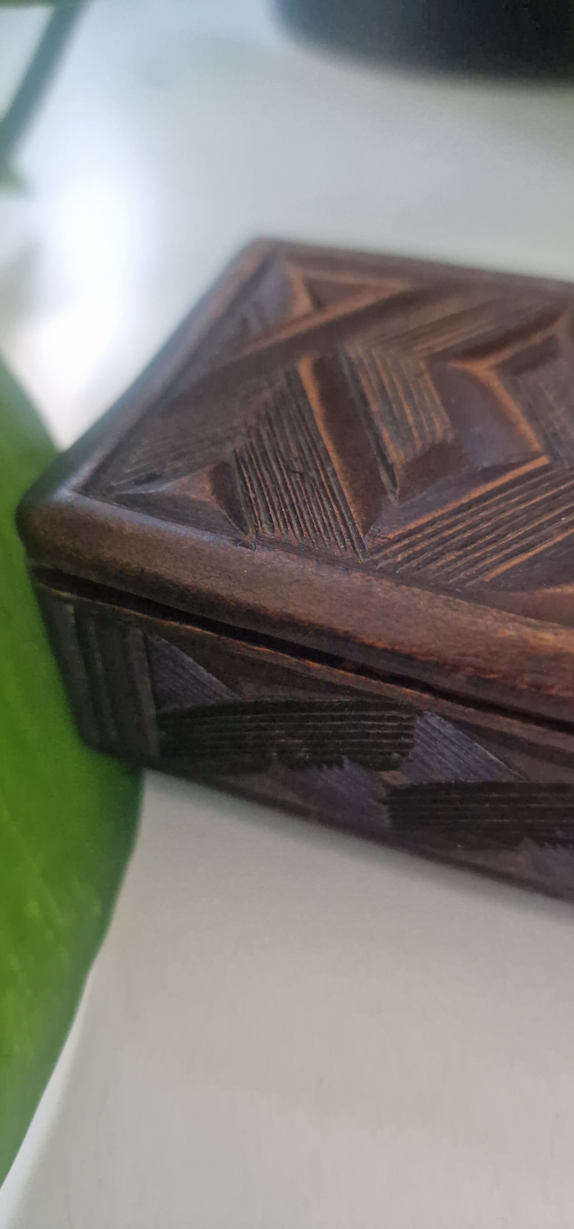 Een houten kistje, heel mooi met de hand bewerkt. Perfect om pennen in op te bergen. Het heeft een apart deksel met een mooie knop erop.