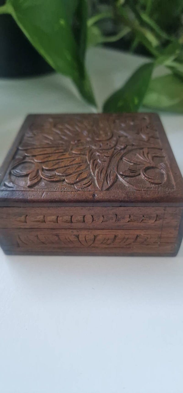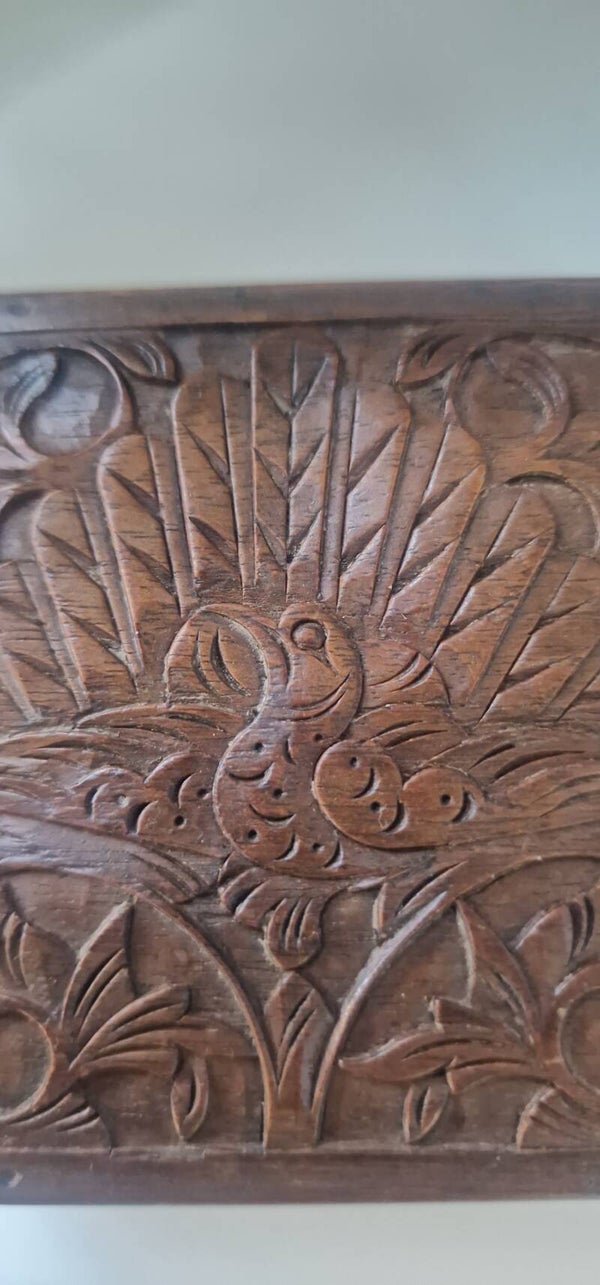 Mooi klein houten vierkant kistje met scharnieren. Het is mooi bewerkt met een afbeelding van een pauw bovenop.