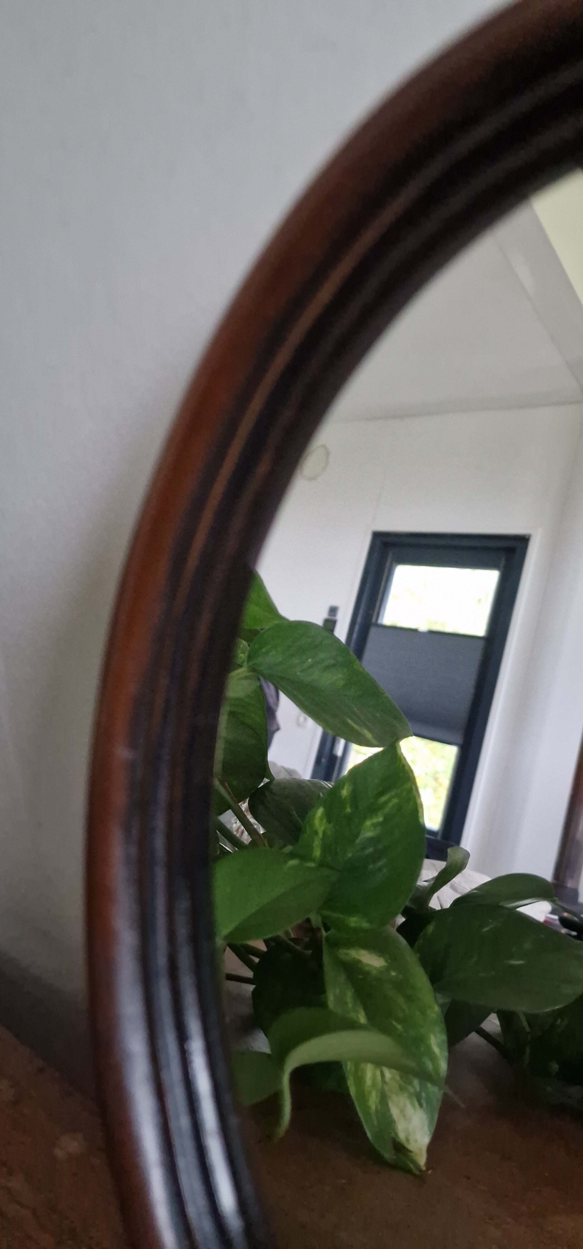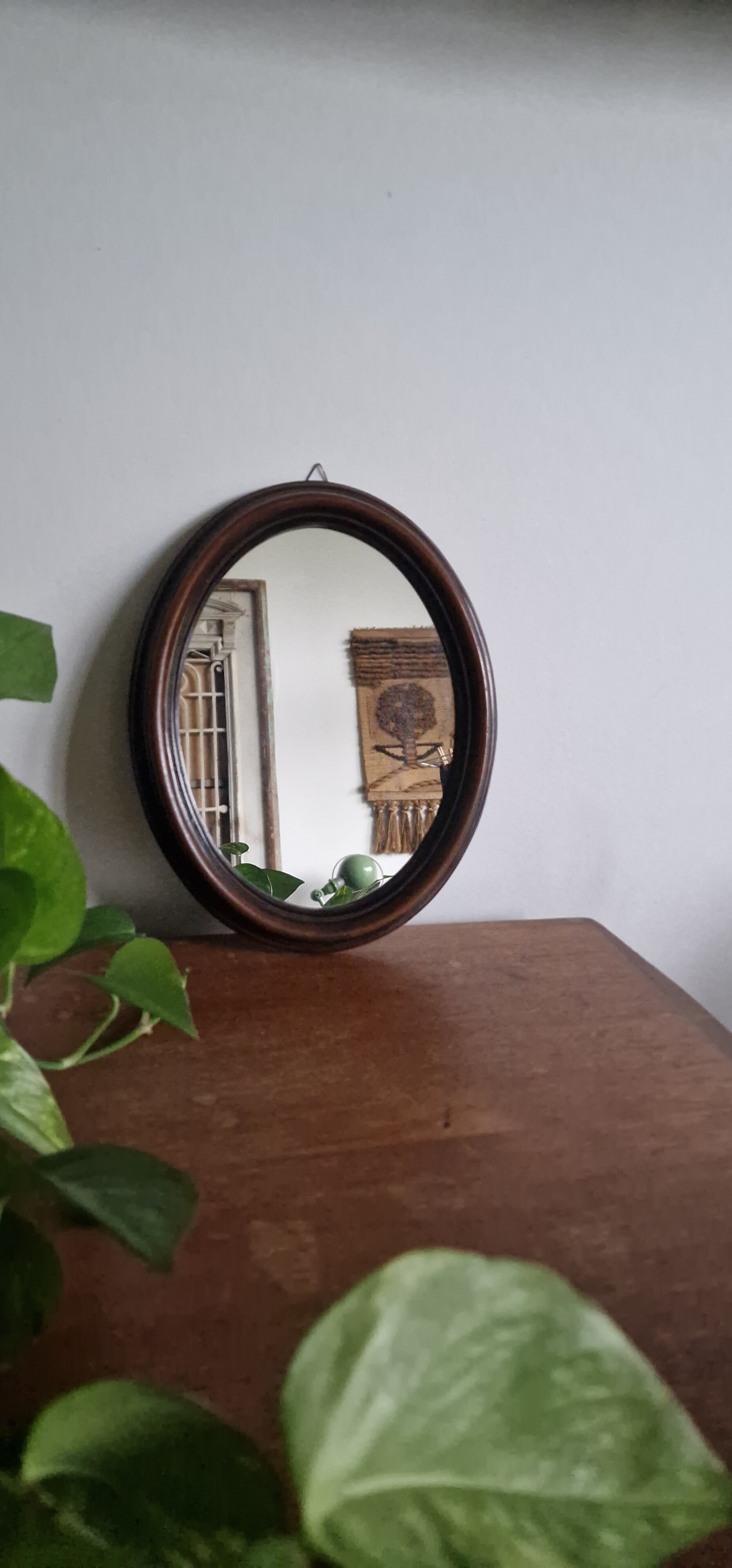 Een ovale vintage spiegel met een houten omranding. Mooi voor op toilet of in de hal. Door zijn formaat is hij op vele plaatsen te gebruiken.