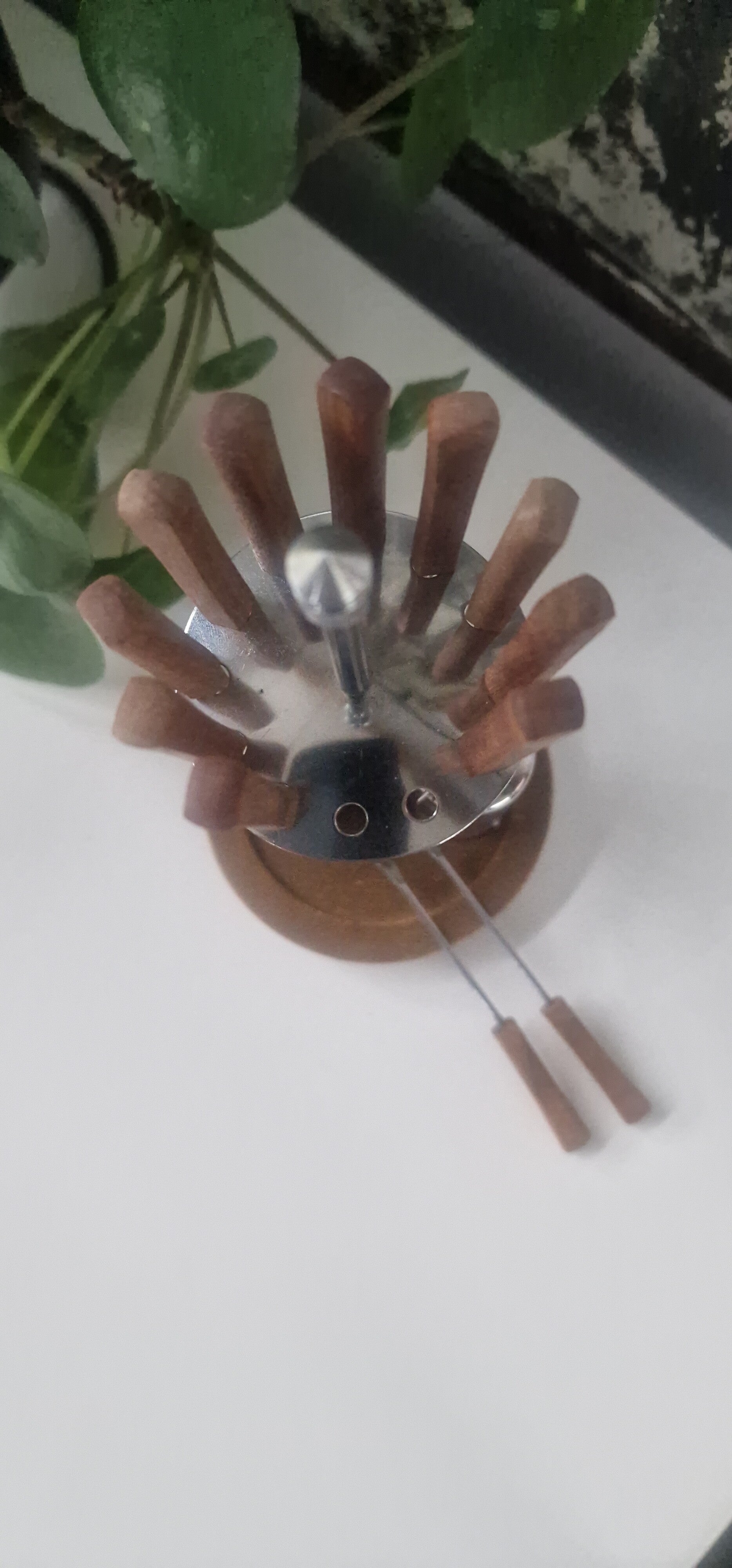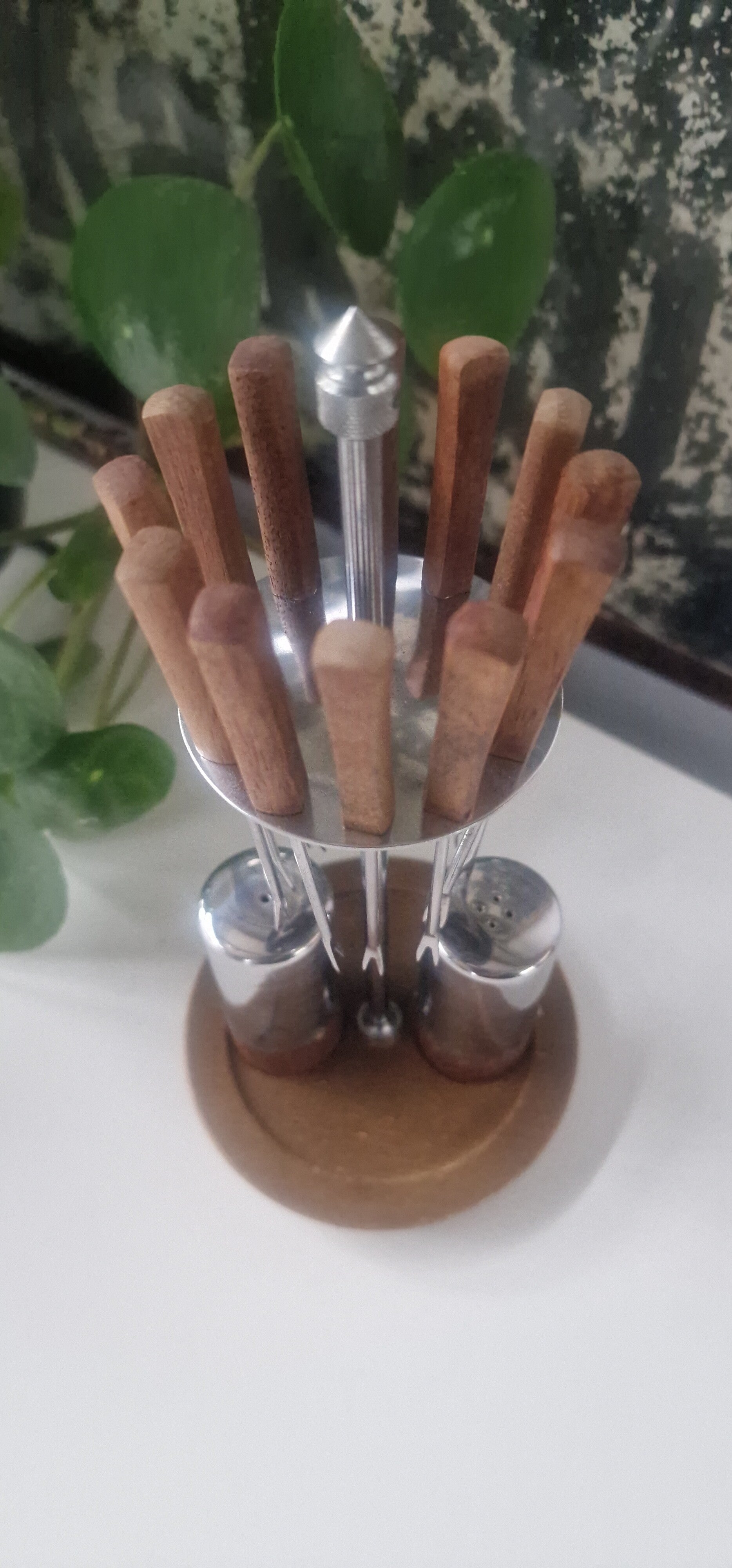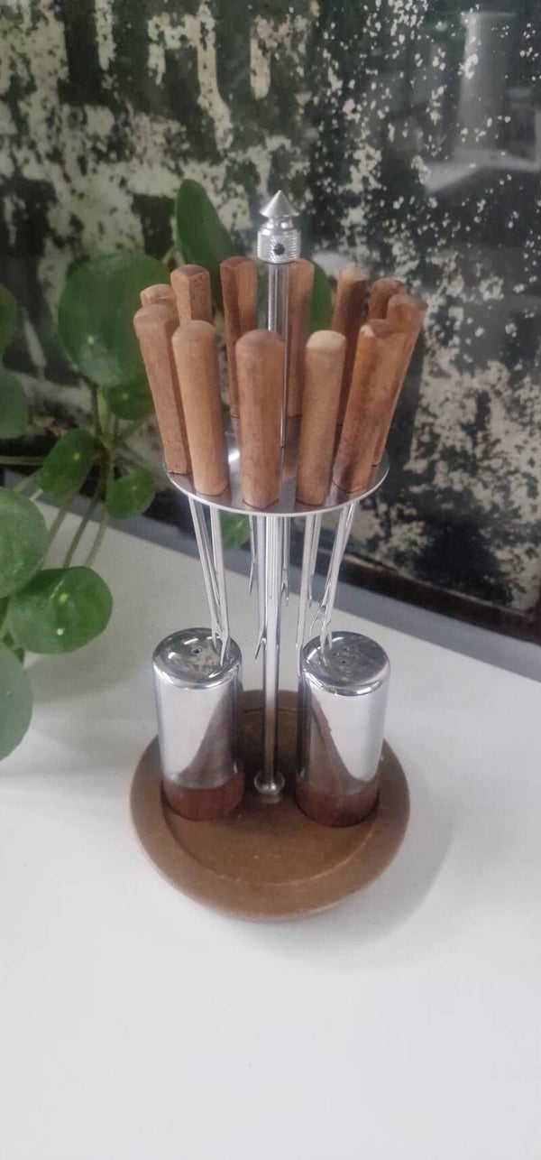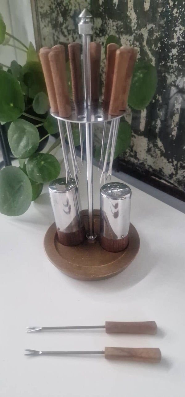 Een vintage set voor op tafel tijdens de fondue of tapas. Het heeft een houten voet, waar een peper met zout stelletje op staat. Met een houder die vast zit aan de voet is er ruimte voor de 12 vorkjes/ spiesjes die erbij zitten.