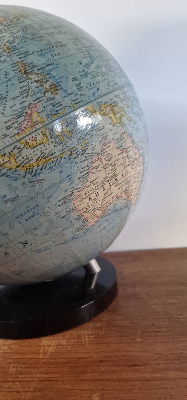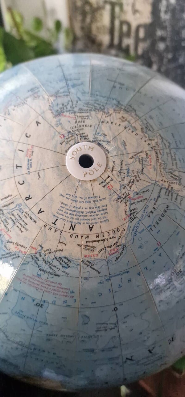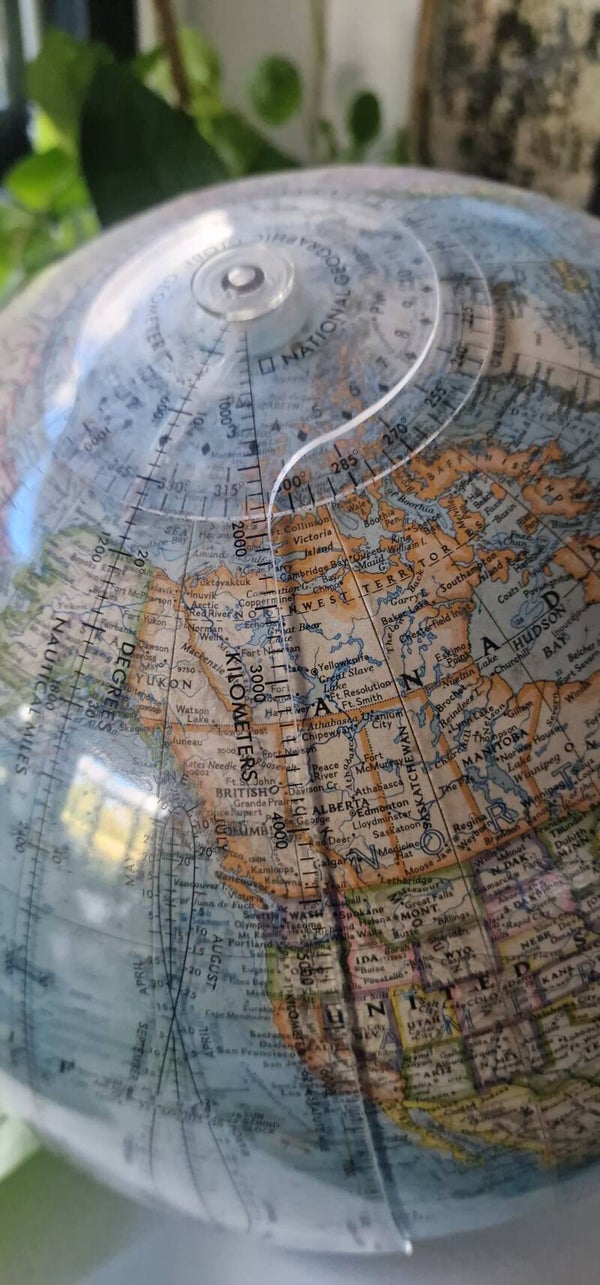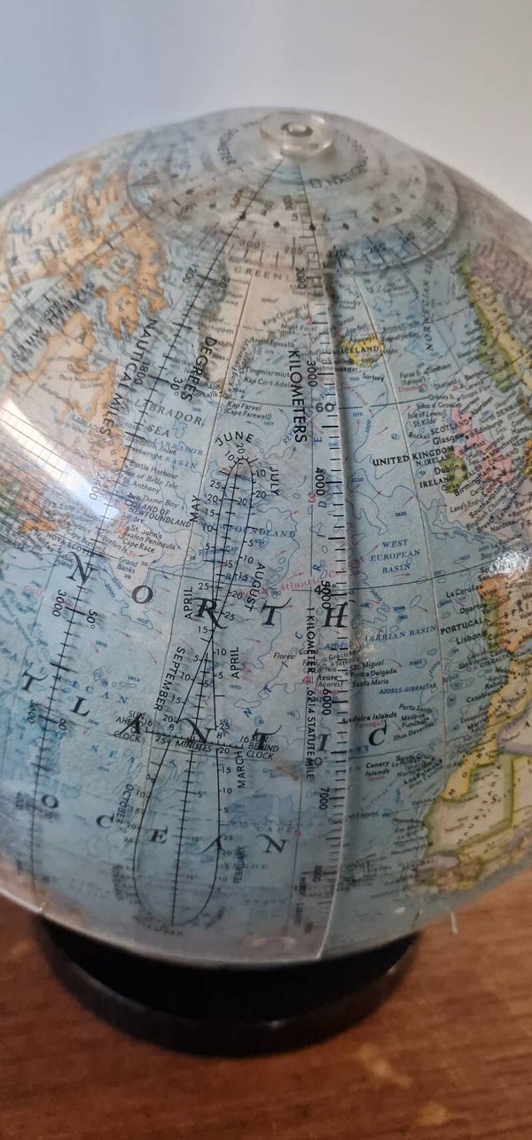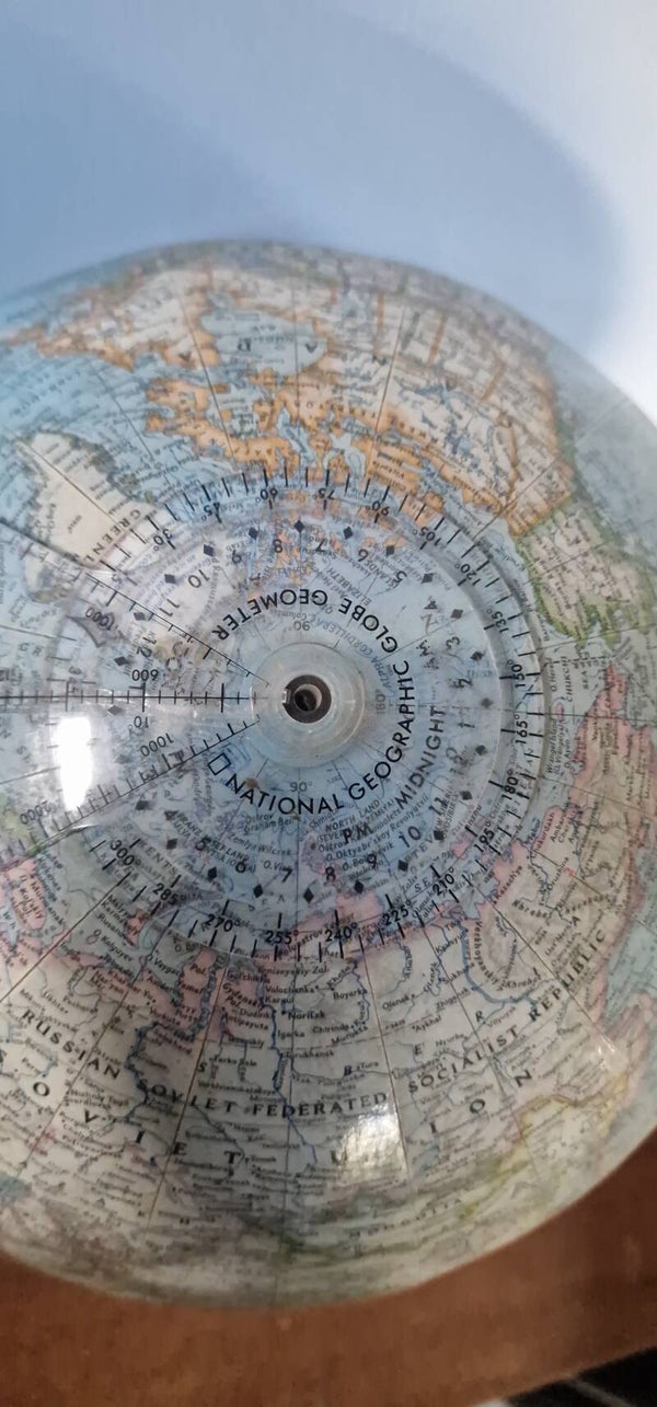 National Geographic Globe Geometer uit de jaren 70 in een nog geweldige staat. Er zit een plexiglas bol aan vast die de tijdswijzerplaat over de hele wereld laat zien, plus nautische mijlen, kilometers en meer.