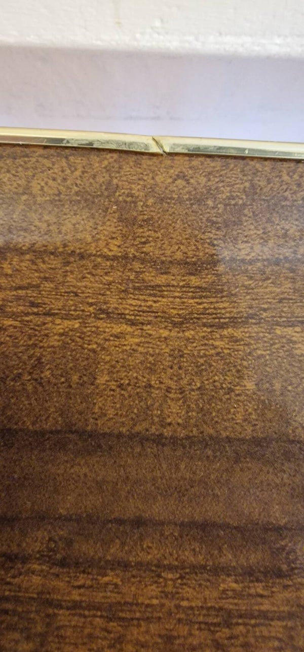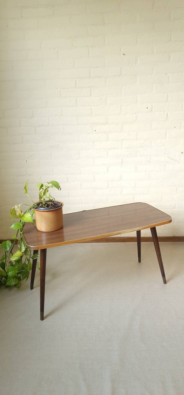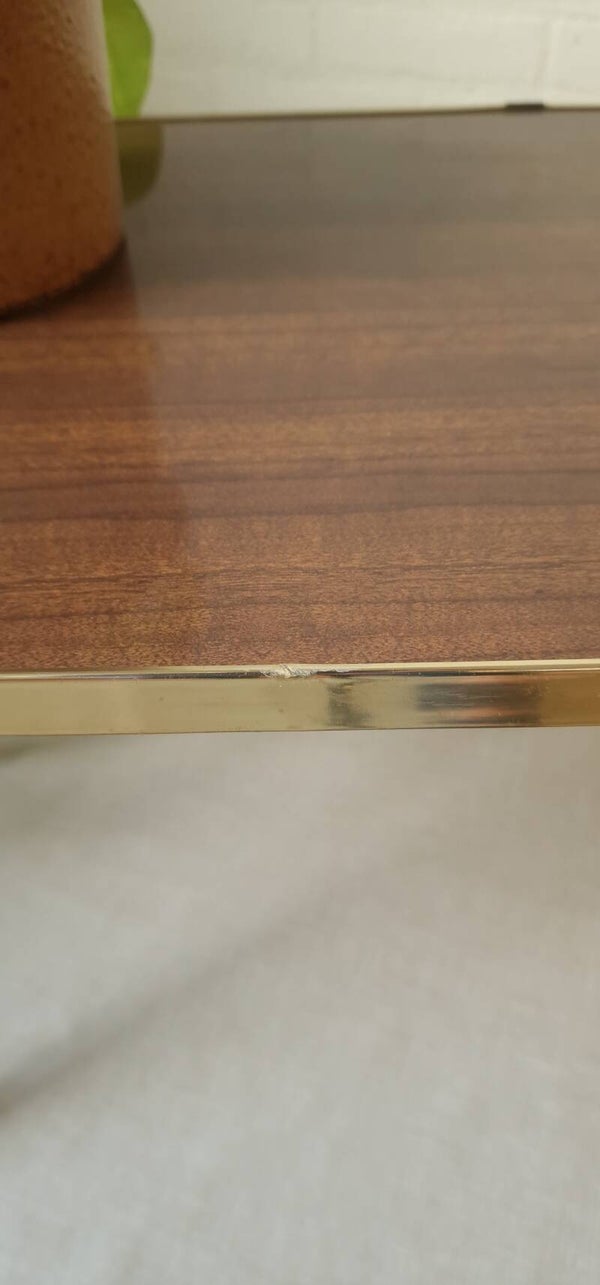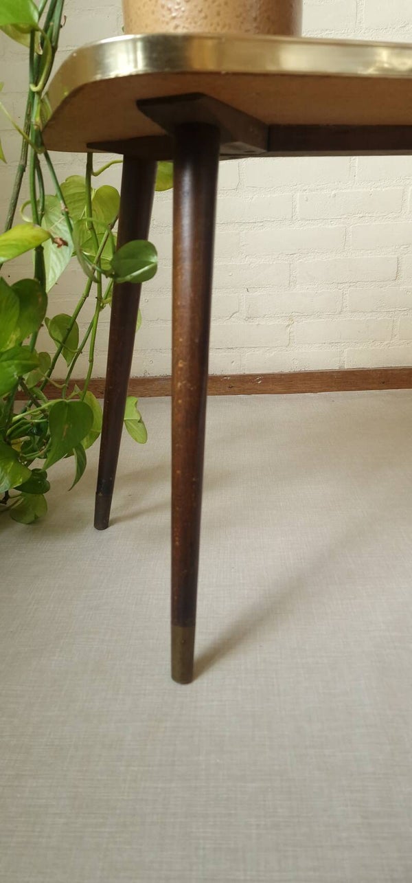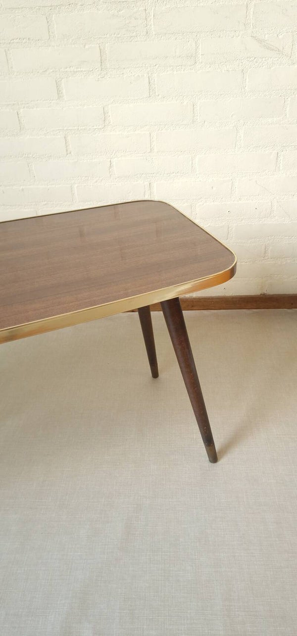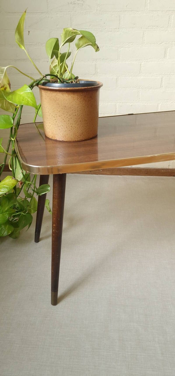 Mooie vintage salontafel met een mooie messing bies om het blad. De pinleg poten zijn stijlvol doordat ze taps toelopen en aan de onderzijde zijn voorzien van een messing afwerking.