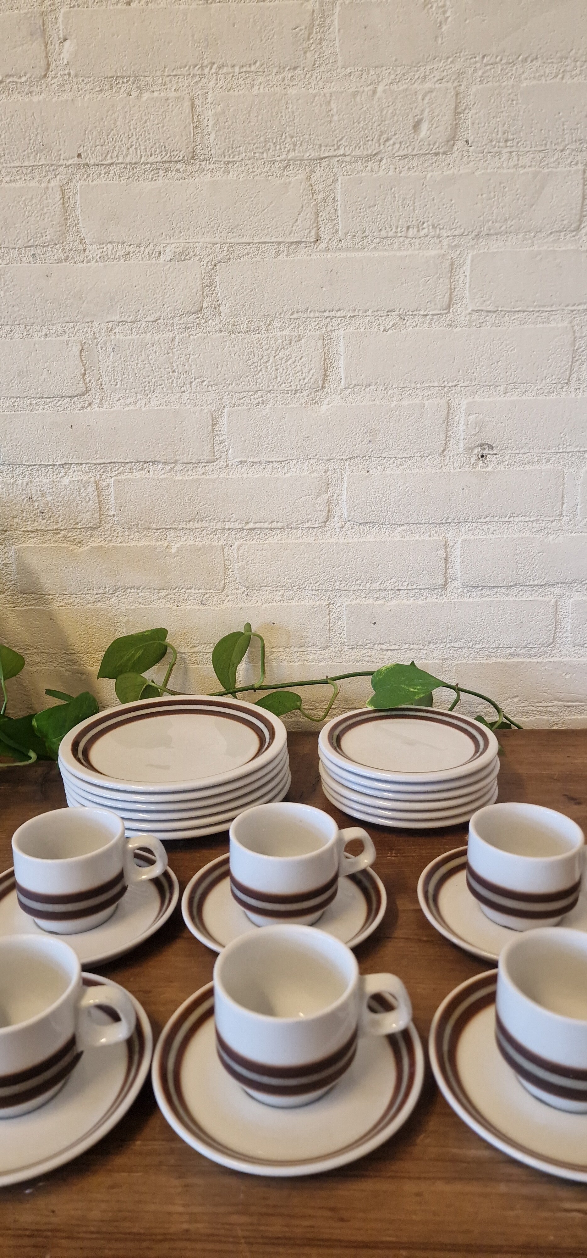 Deze mooie vintage set van het merk Lilien Porzellan uit Oostenrijk is gedecoreerd met de hand. De strepen geven deze set een strak design.