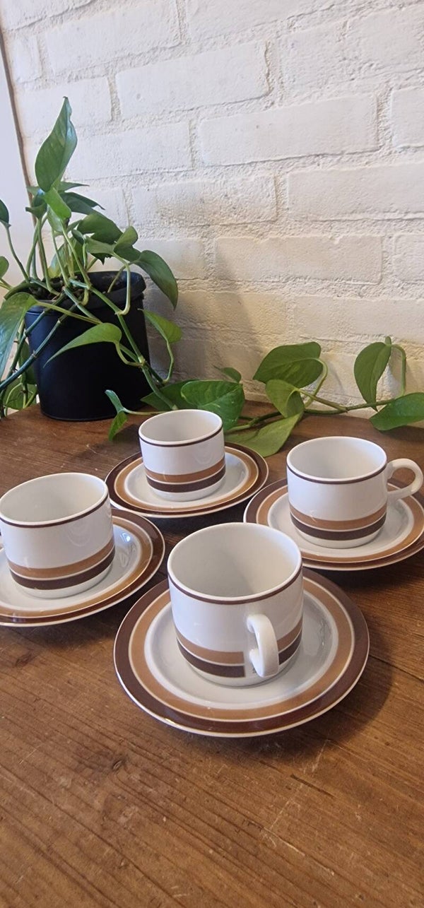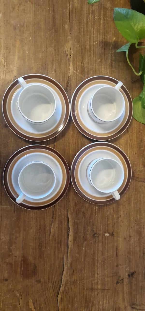 Ze verkeren in redelijke vintage conditie, geen chips of iets dergelijks aan de kopjes, alleen 3 van de 4 schoteltjes hebben een hele kleine chip, zie laatste drie foto's. Daar heb ik de prijs dan ook op aangepast.