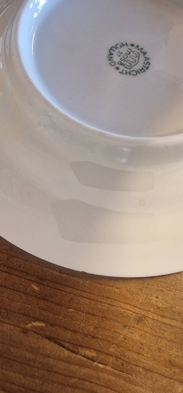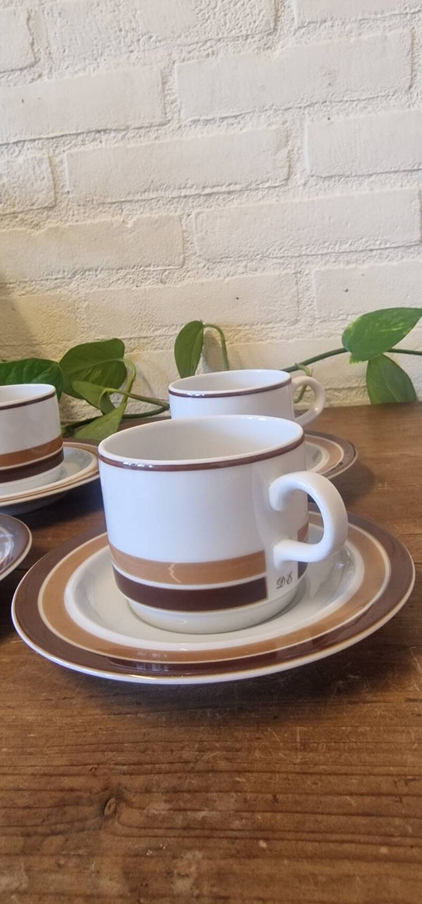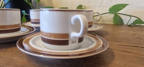 Deze porseleinen set van 4 kop & schotels zijn gemaakt door MOSA Maastricht voor Douwe Egberts. De kopjes zijn onder het oor voorzien van een DE in sierletters.