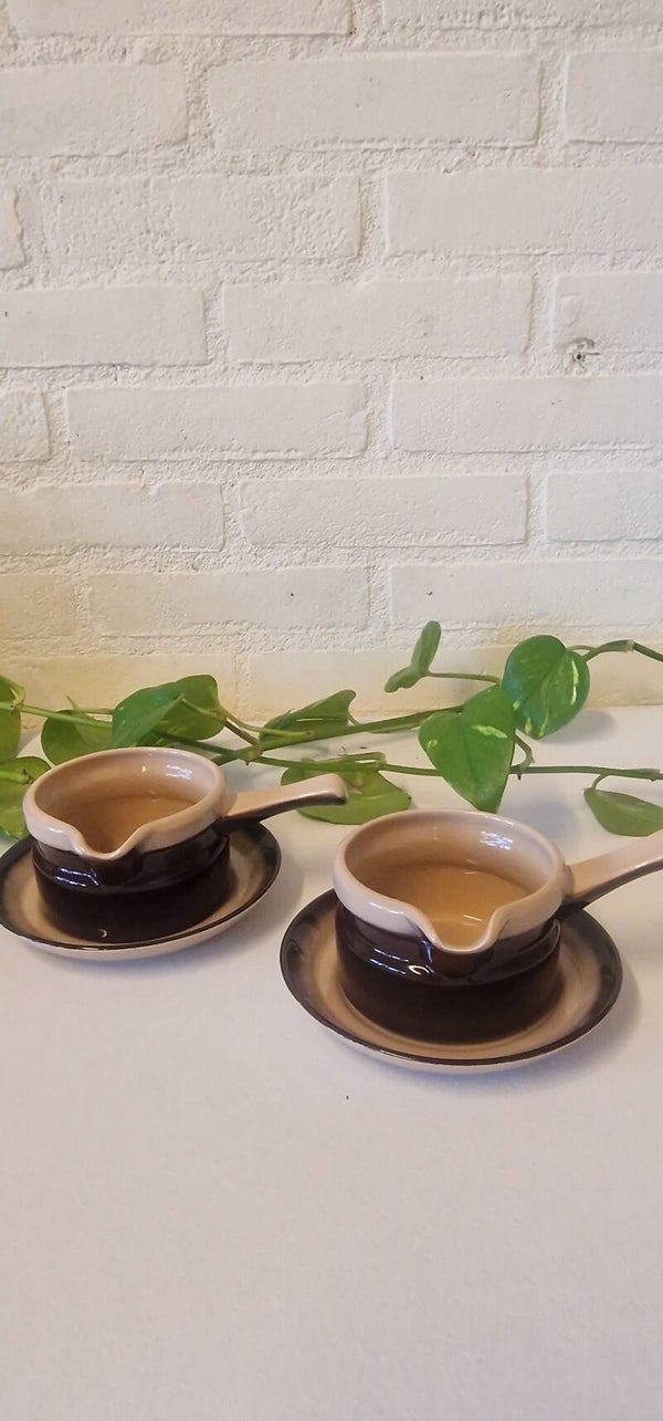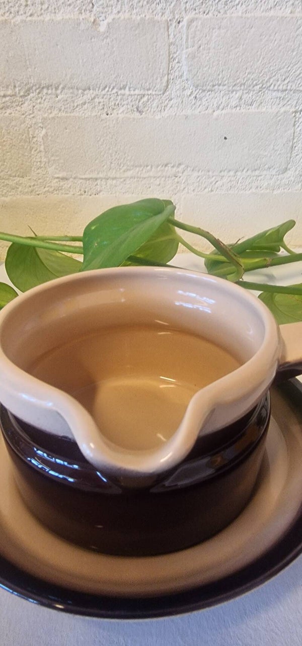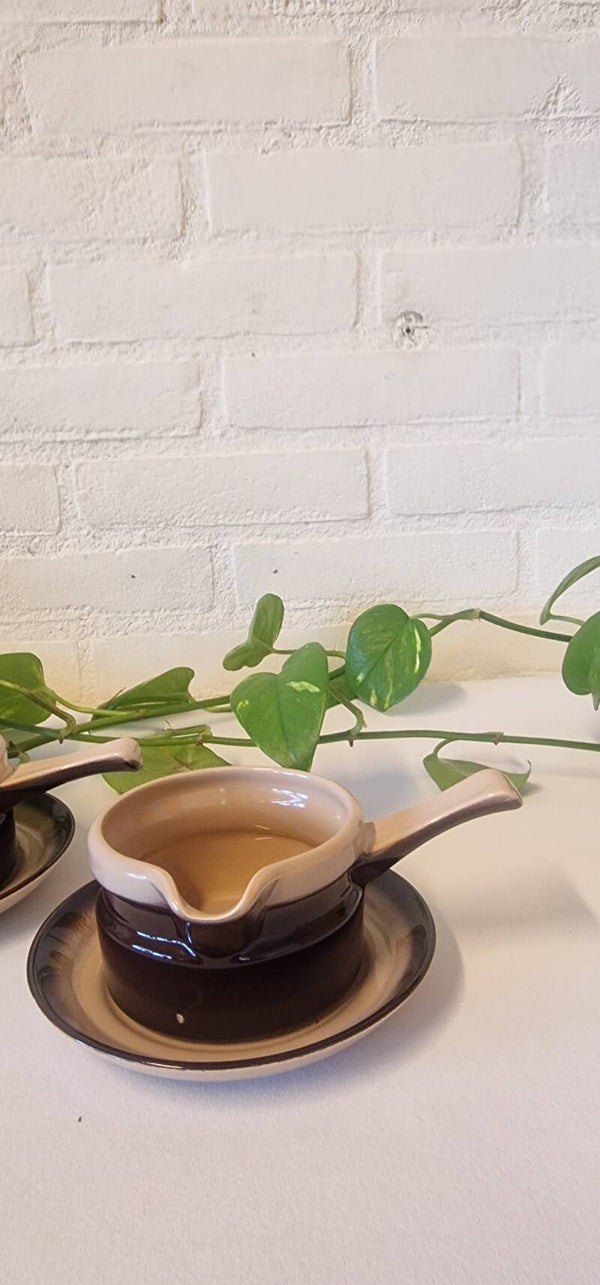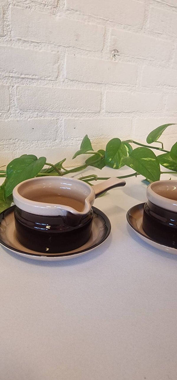 Deze vintage jus / saus bakjes in het beige met een bruine rand is van het merk Wedgwood. Mooie goede kwaliteit gemaakt in Engeland. Perfect te gebruiken tijdens diner, voorzien van onderbord.