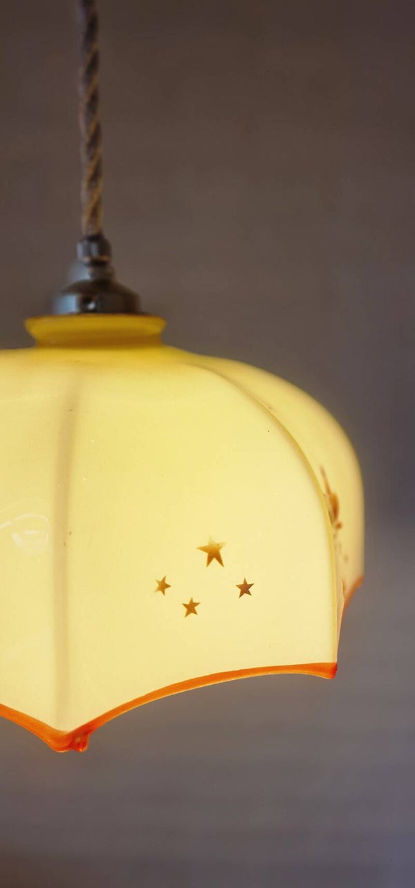 Deze prachtige vintage hanglamp met een glazen parapluvormige kap is zo lekker vrolijk. Super leuk voor op de kinderkamer. De gele kap heeft een rode streep aan de onderzijde en is beschilderd met vlinders.