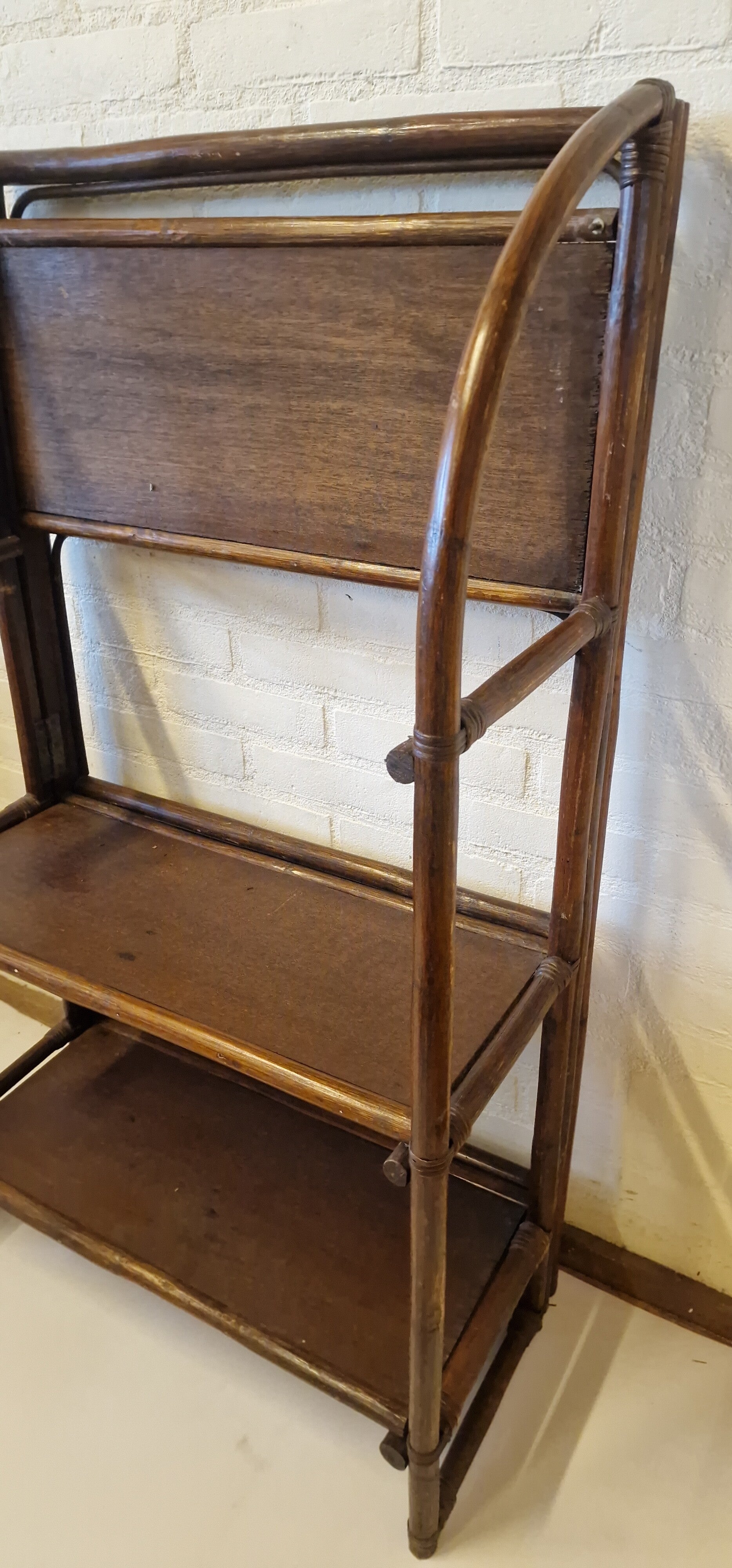 De perfecte kast voor als je niet veel ruimte hebt. Deze mooie vintage jaren 70 bamboe / rotan kast heeft 3 schappen die allen opvouwbaar zijn. Hierdoor kun je als je hem niet gebruikt opbergen.