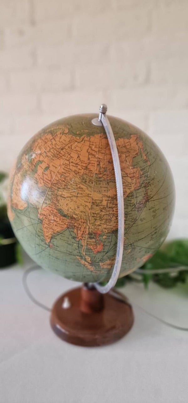 De globe heeft een hoogte van ongeveer 45 cm en een doorsnede van 33cm. De doorsnede van de houten poot is 20 cm.