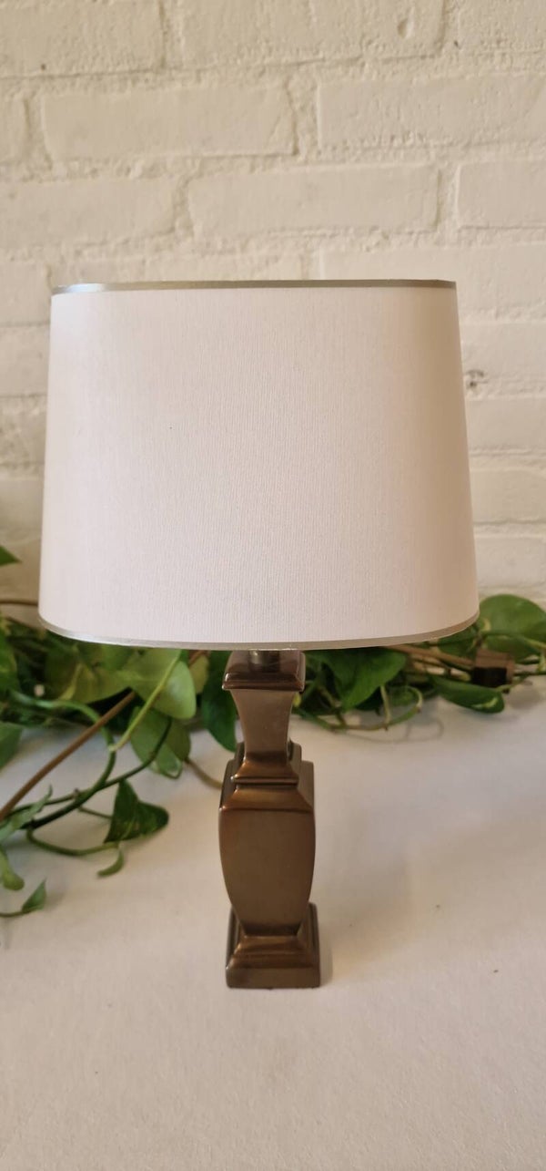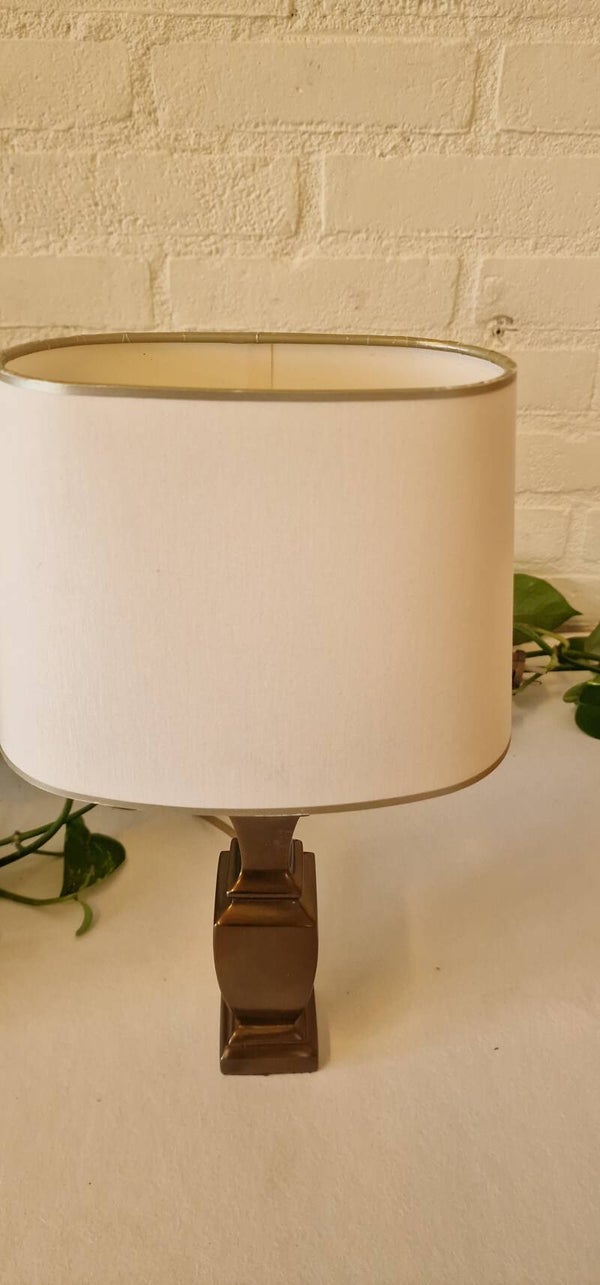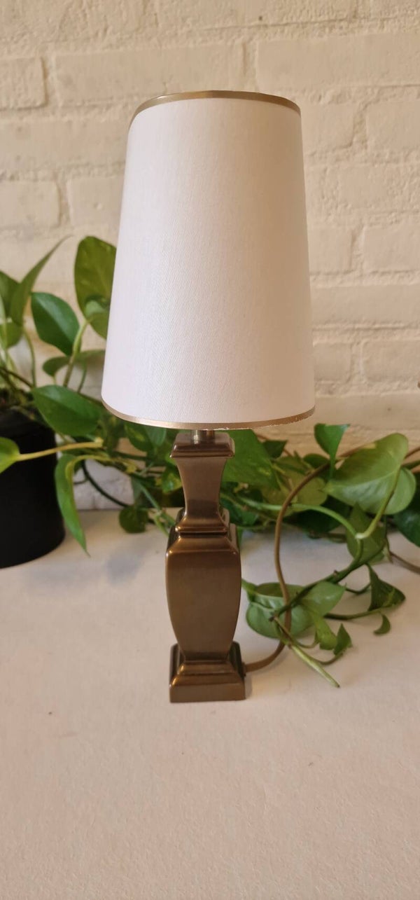 Schitterende set lampen van het Nederlandse bedrijf Kullmann Lampen uit Culemborg. De mooie poot van messing met de lichte stoffen kap met goudkleurige afwerking doet een beetje denken aan de Regency Hollywood stijl. Perfect voor op het nachtkastje, echte sfeerverlichting.