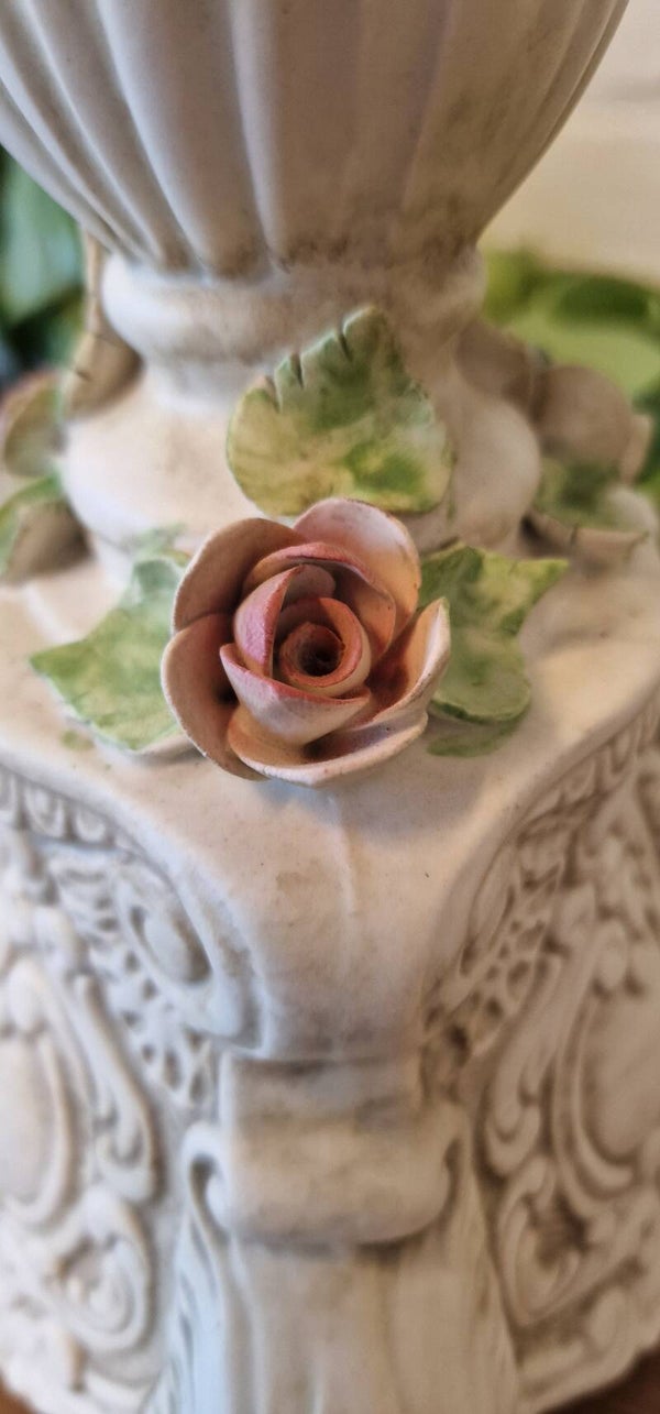 Een mooie wit brocante lampenpoot met bloemen versiering. De lamp is nog een hele goede vintage conditie. Super mooi in een romantische setting.