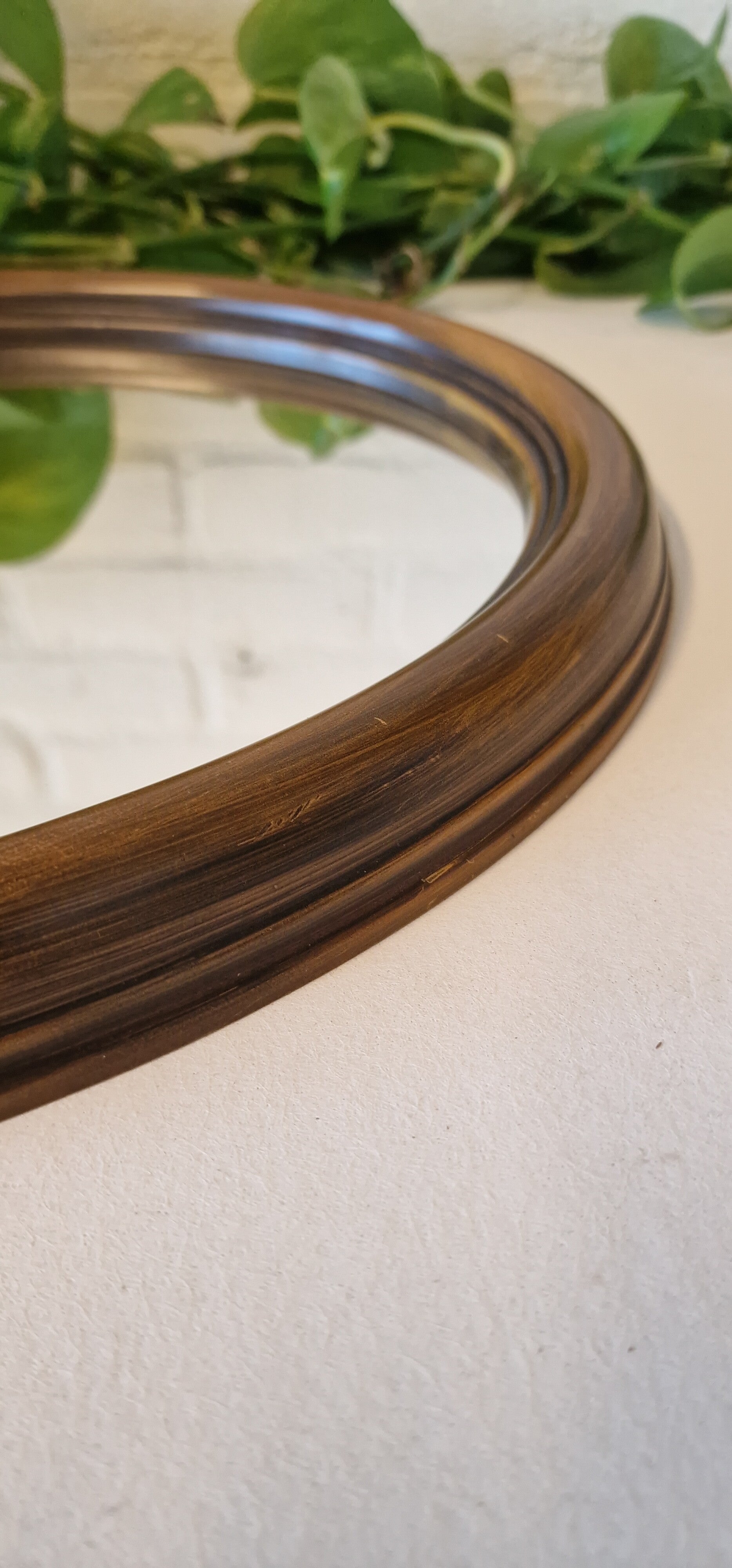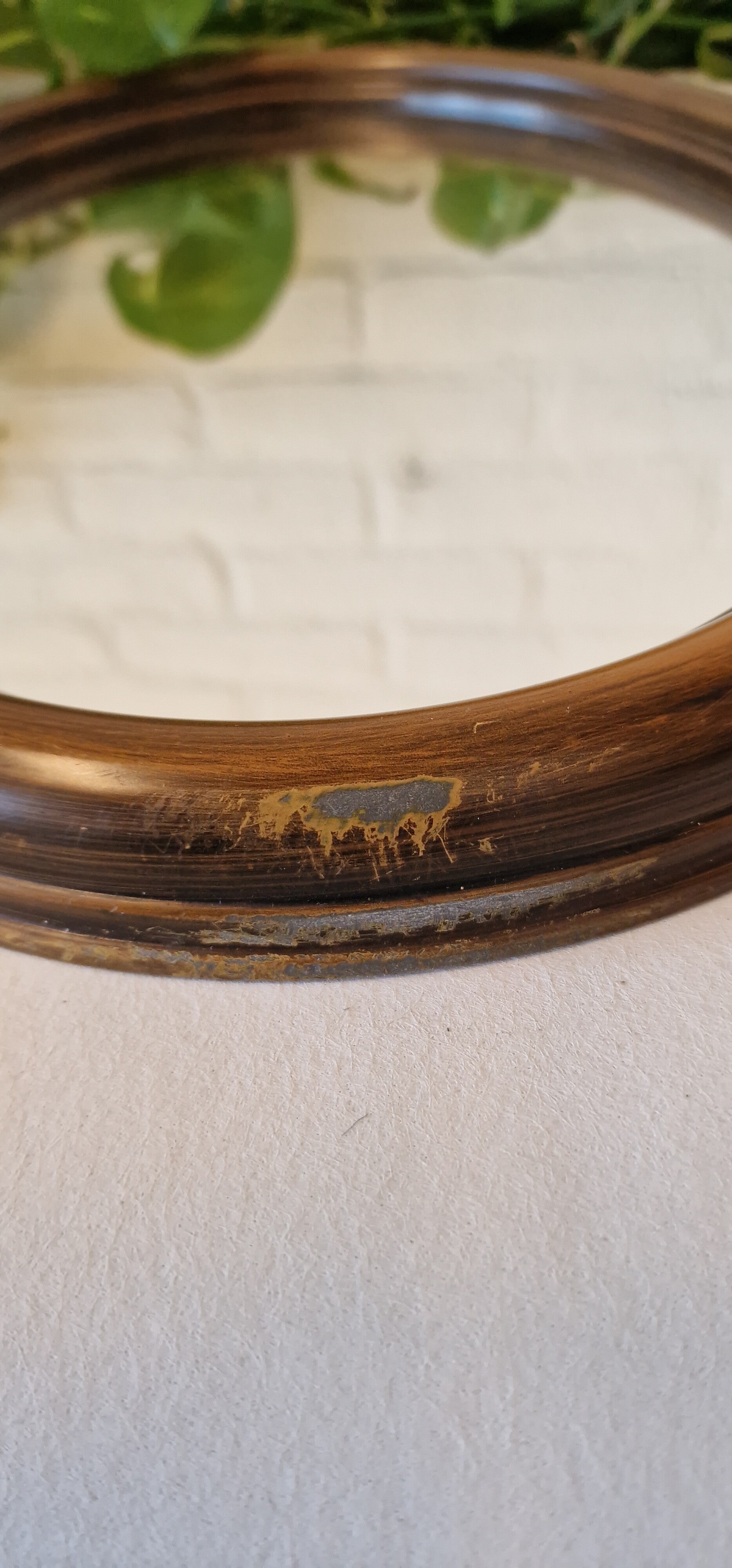 Een ovale vintage spiegel met een houten omranding. Mooi voor op toilet of in de hal. Door zijn formaat is hij op vele plaatsen te gebruiken.