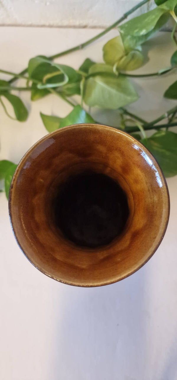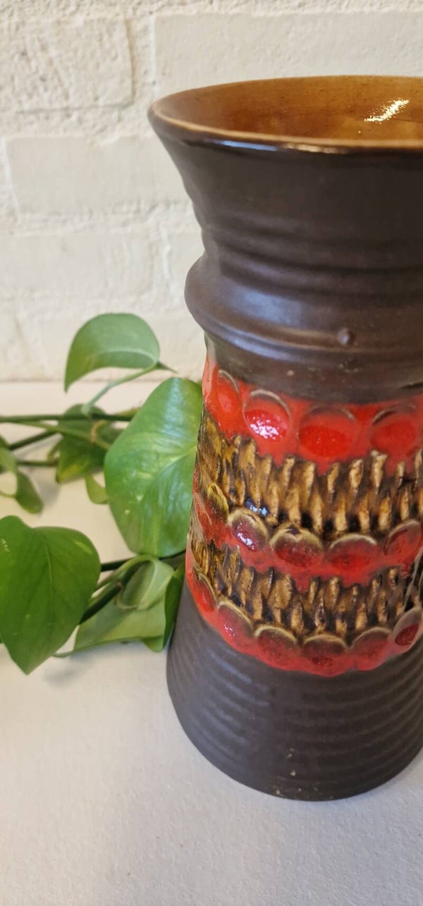Een mooie fleurige West Germany vaas in de kleuren bruin, oker, en rood.
