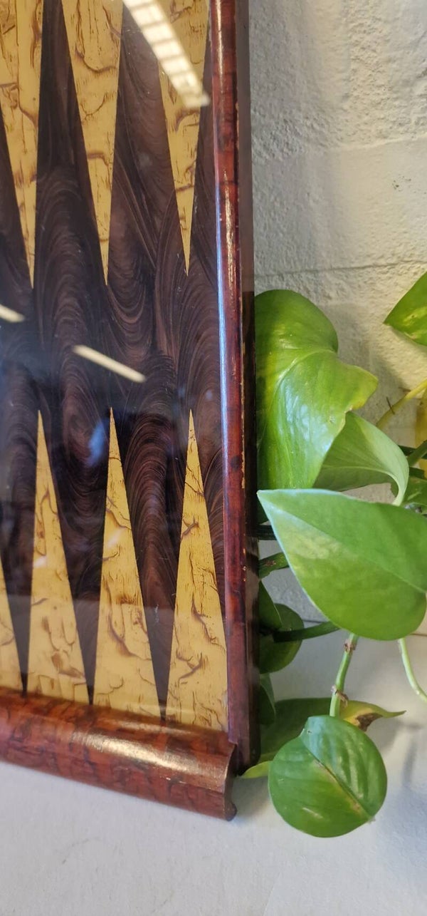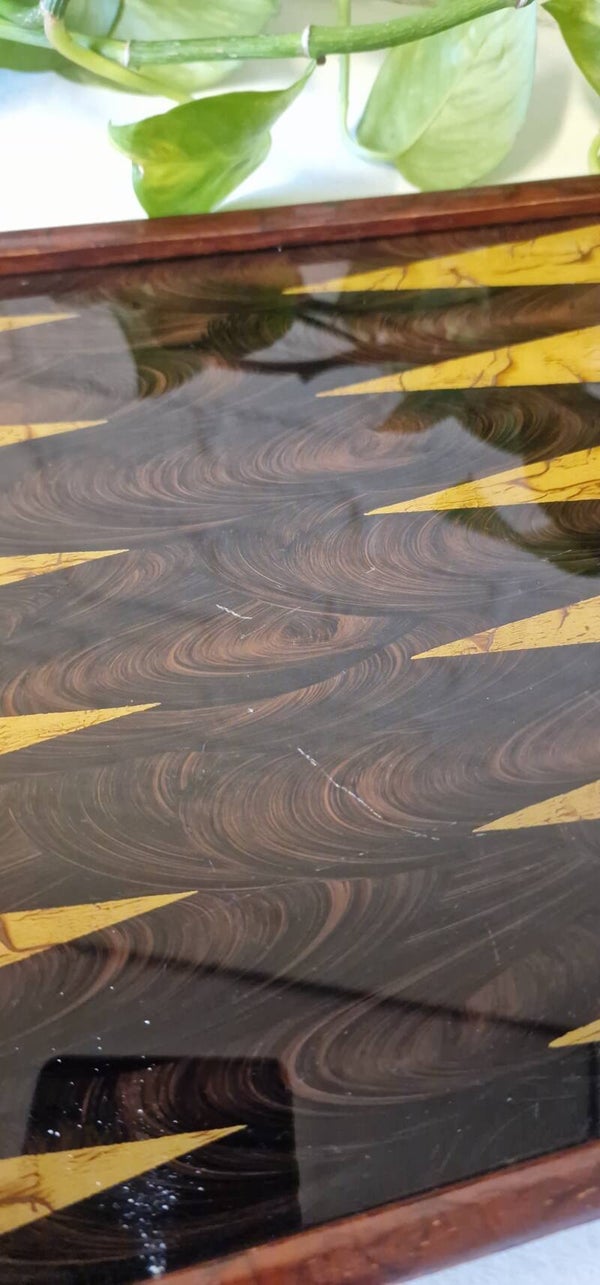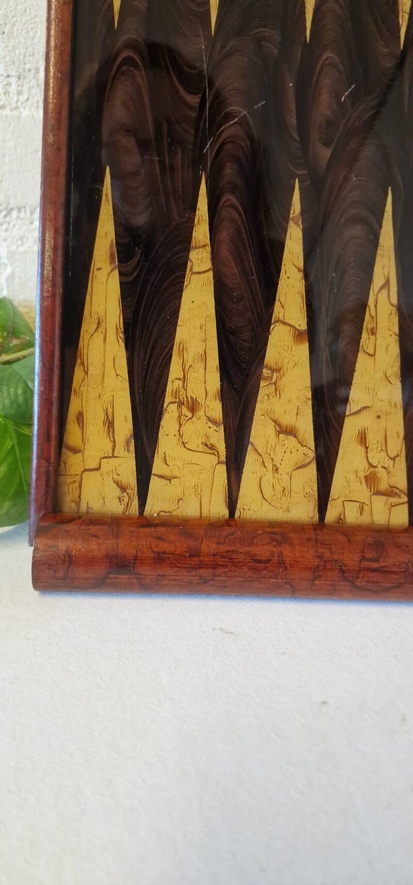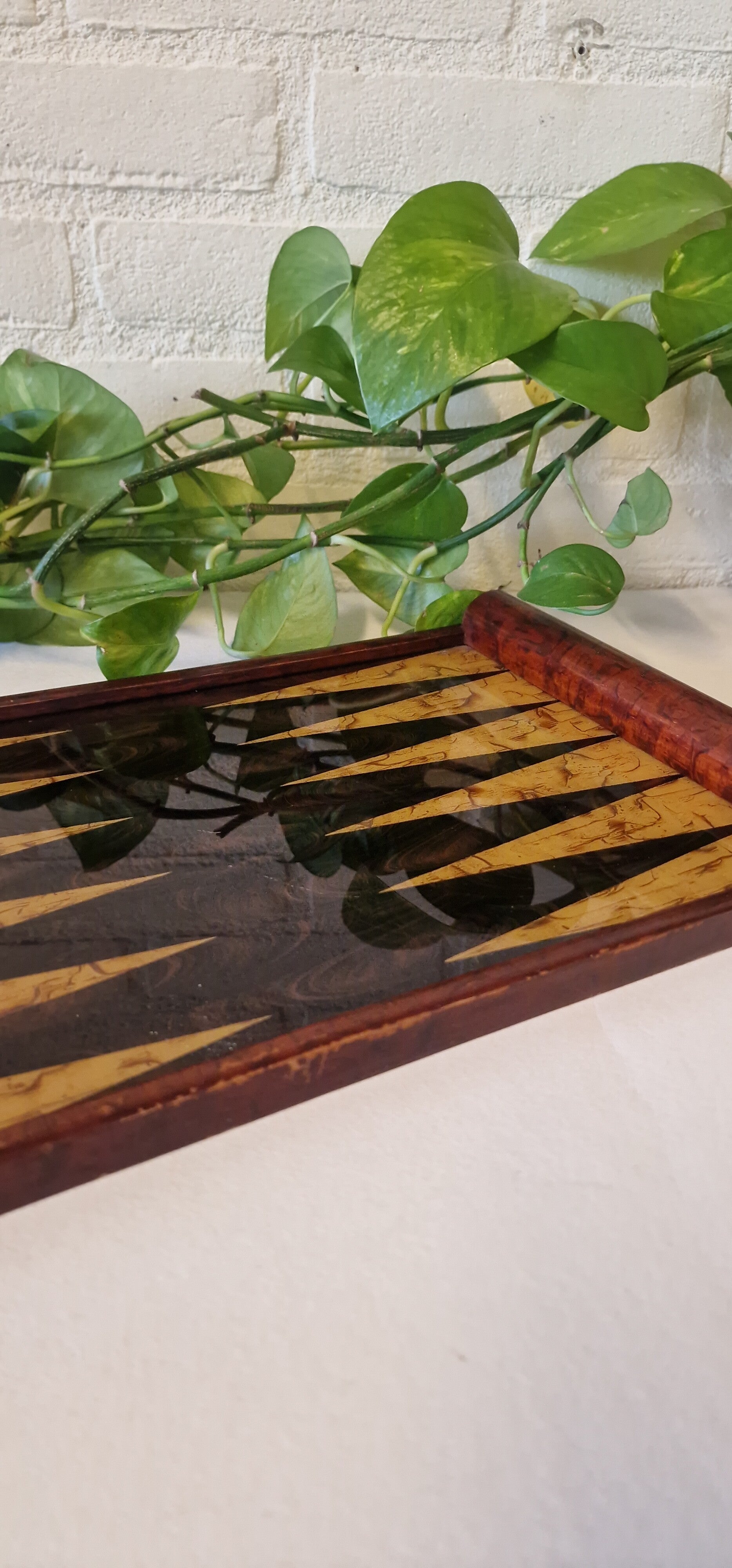 Mooi vintage dienblad met het motief van backgammon erop. Waarschijnlijk jaren 60, chique en tijdloos.