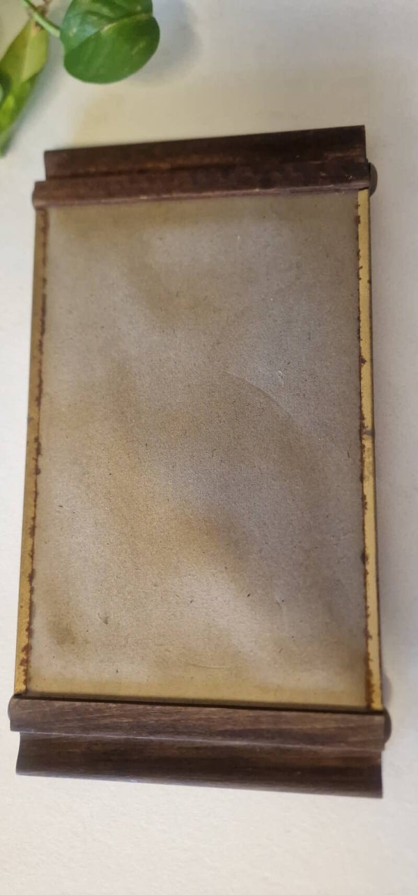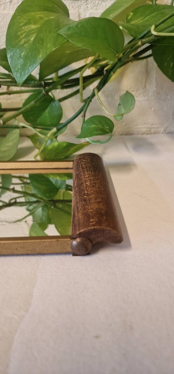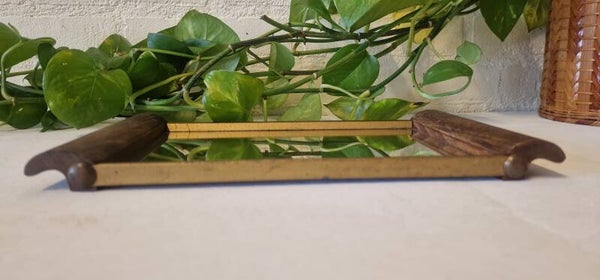 Een supermooi klein dienblad van hout met mooie afgeronde handgrepen. Met koperkleurige omlijsting van de spiegel die de binnenkant vormt.