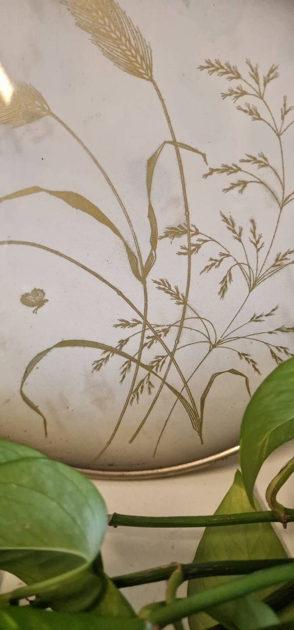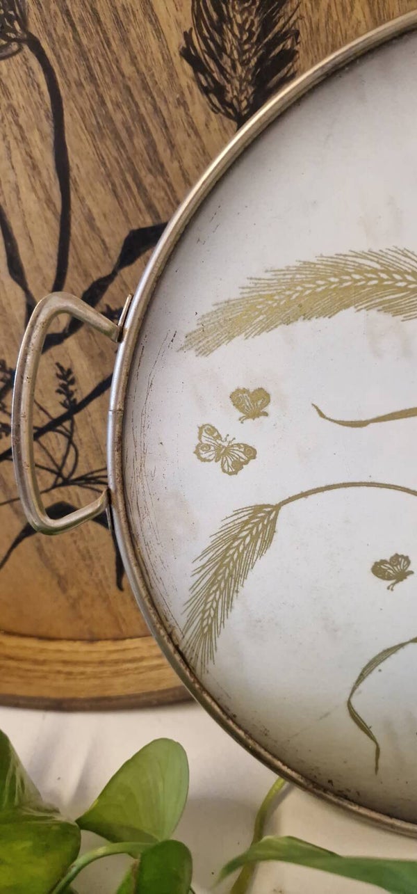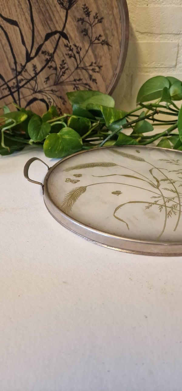 Een mooie taartschaal / taartstandaard / dienblad uit de jaren 30/40. Het is een metalen frame met twee handgrepen met daar binnen in een glazen blad. Het blad is wit met een goudkleurige decoratie van tarwe en vlinders.