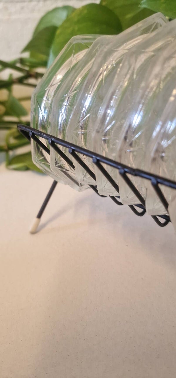 Vintage zwart metalen houder met glazen onderzetters. De houder is zwart en heeft witte pootjes, waar er één van mist.