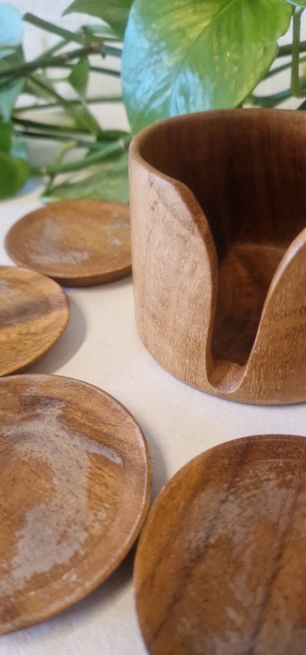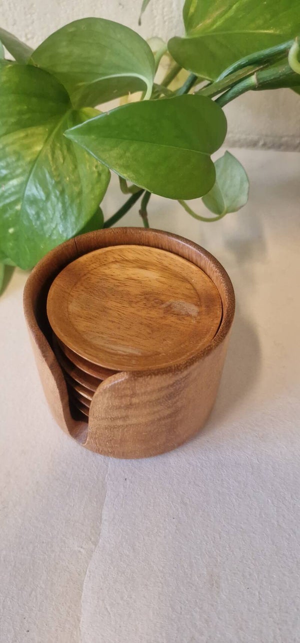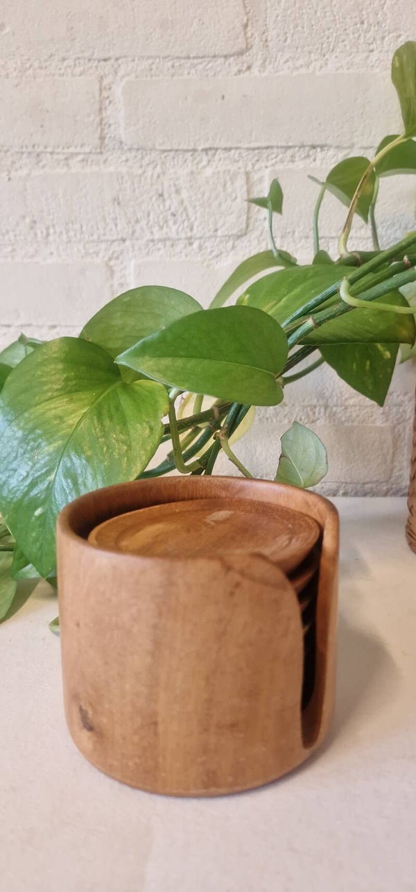 Mooie set van 6 onderzetters in een houten ronde houder. Wel goed gebruikt, maar zijn nog super leuk.