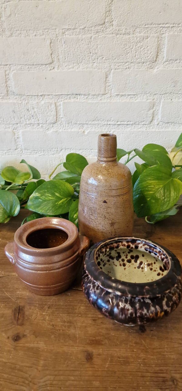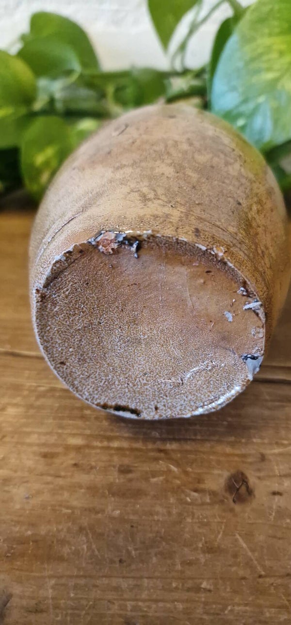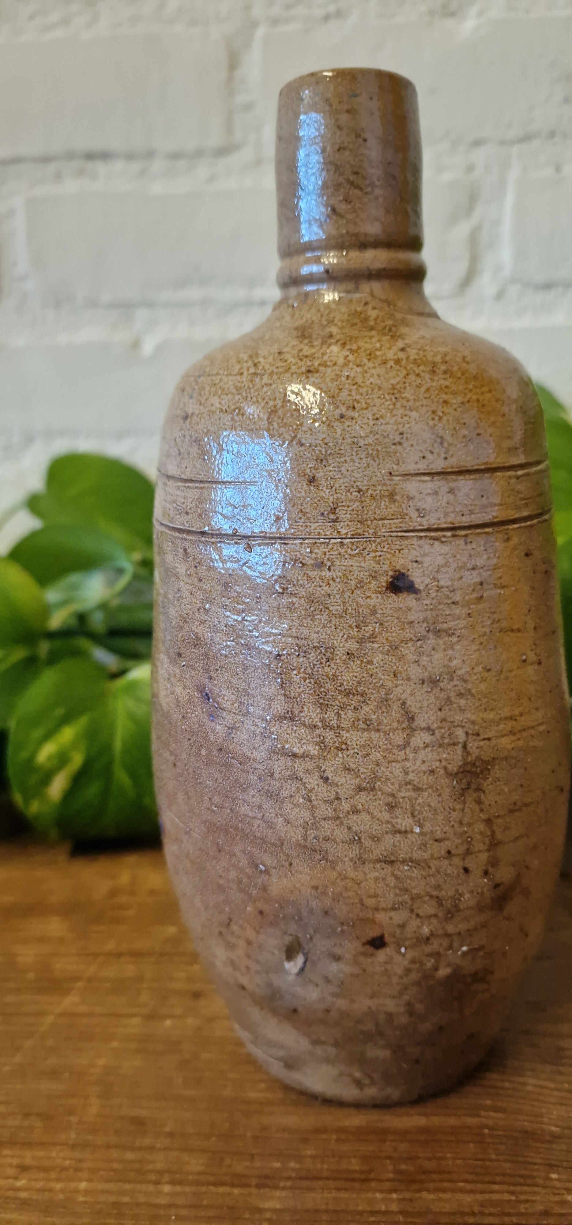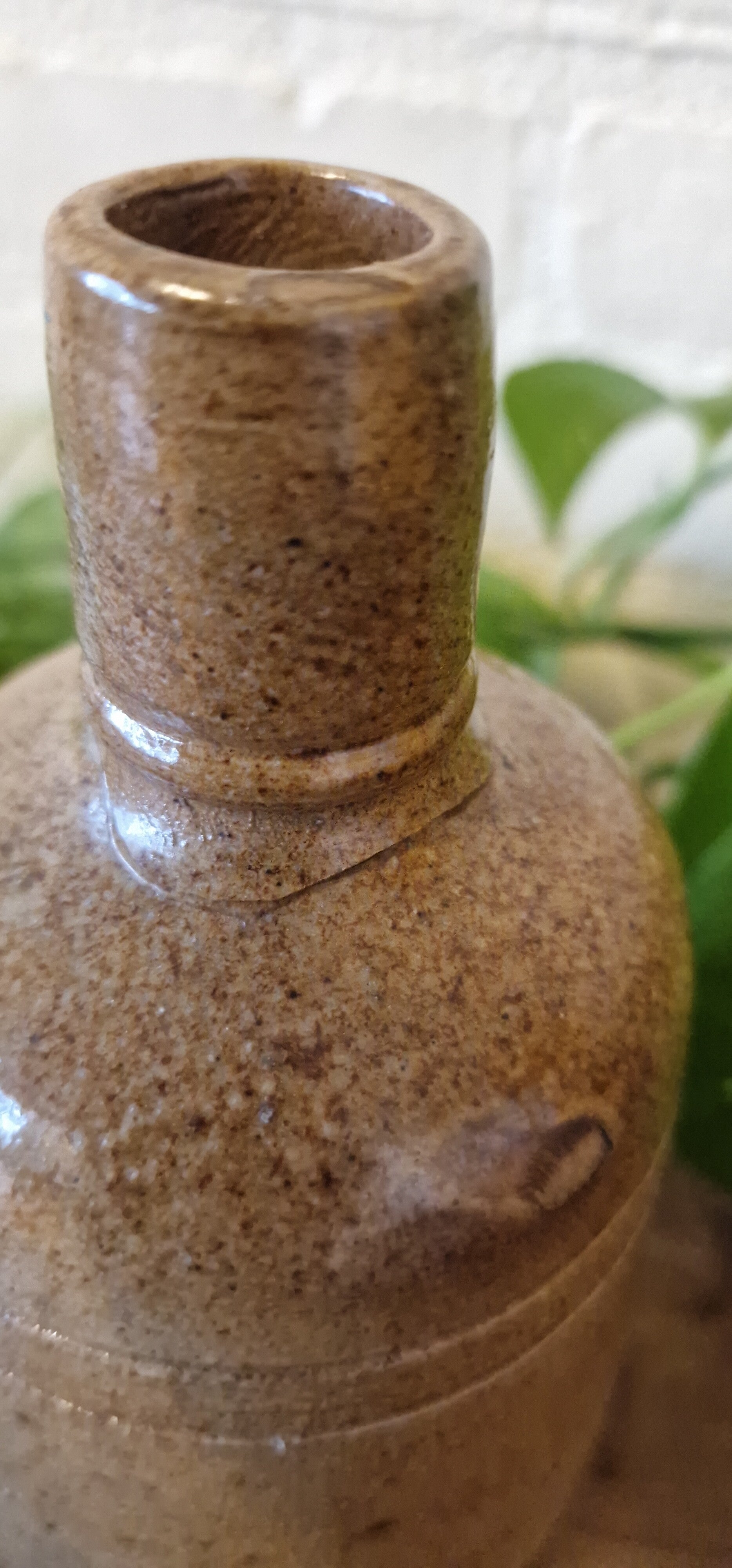Mooie oude vaas in vorm van een kruik. Leuk met een droogbloemje erop. Hij is bij de hals ooit gebroken geweest en weer geplakt. Dit stoort niet.