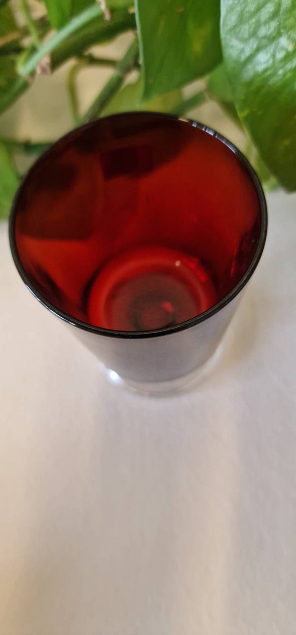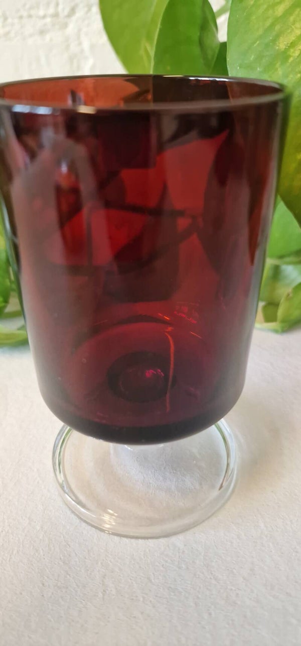 Luminarc glas in de kleur rood op een doorzichtige poot. Ook nog iets groter formaat aanwezig. Leuk om te combineren.