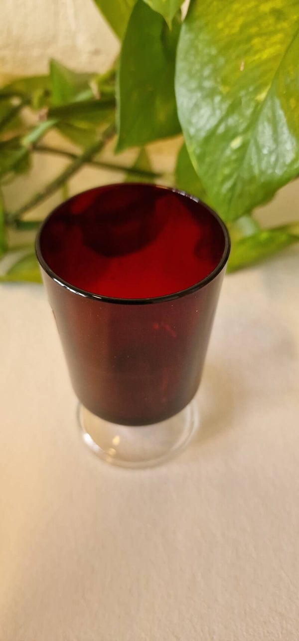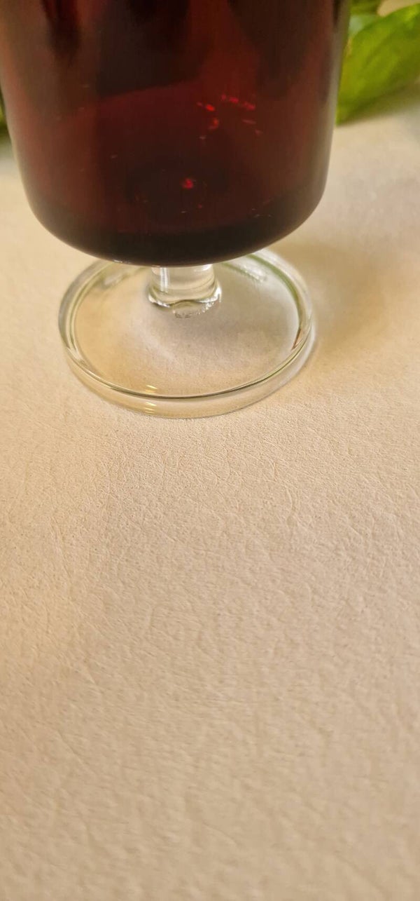 Luminarc glas in de kleur rood op een doorzichtige poot. Ook nog iets kleiner formaat aanwezig. Leuk om te combineren.