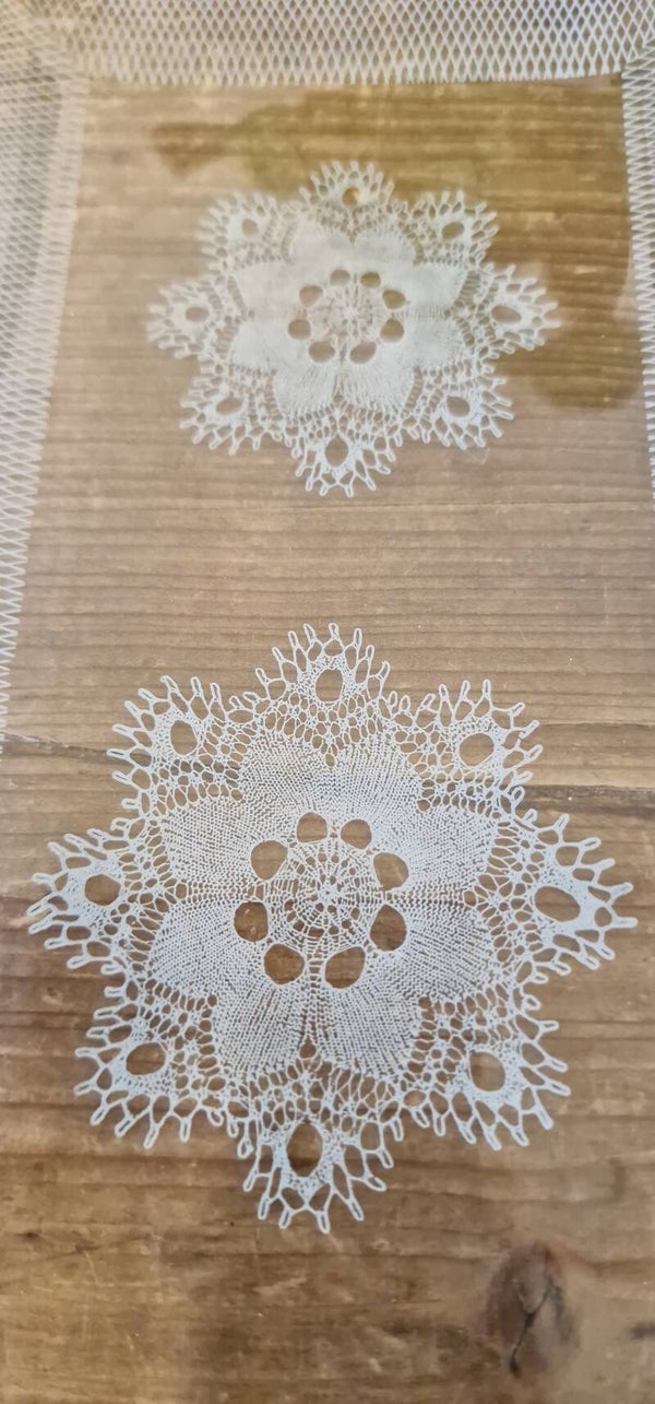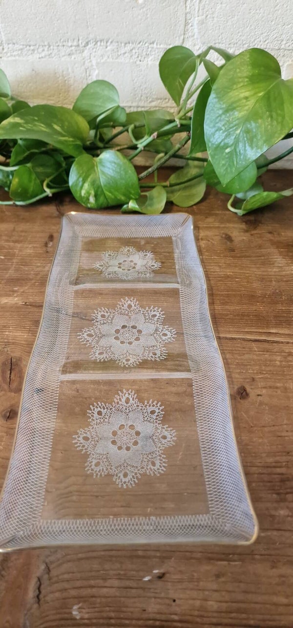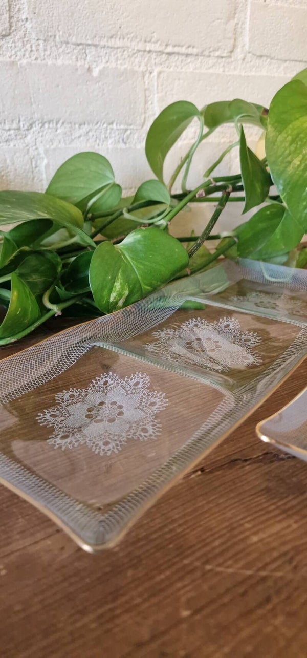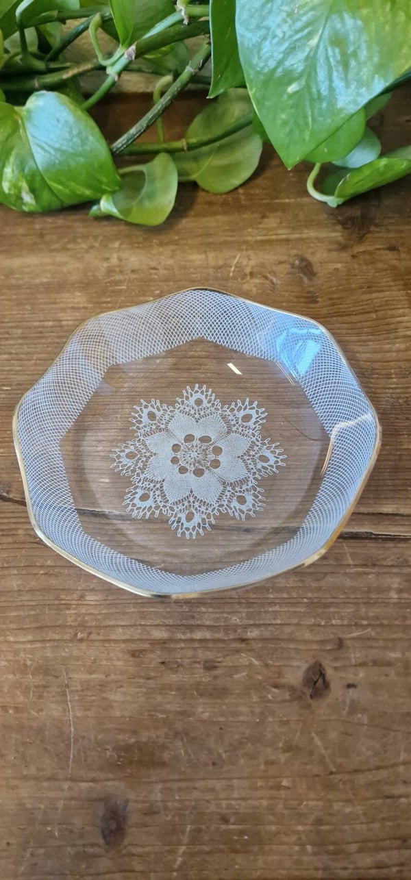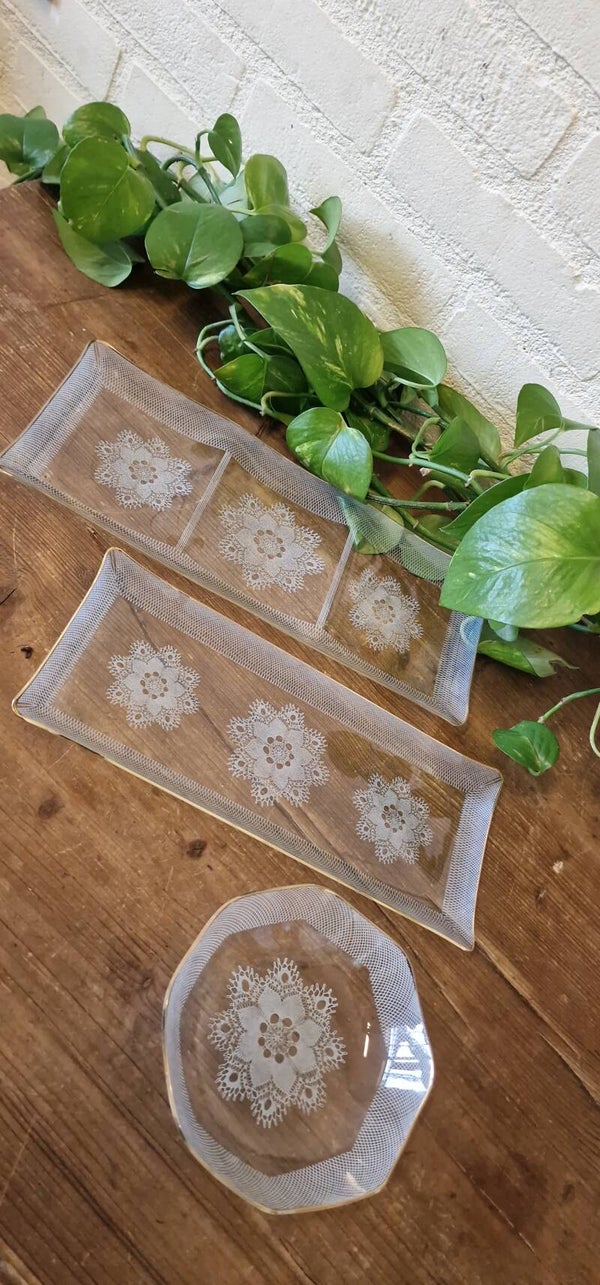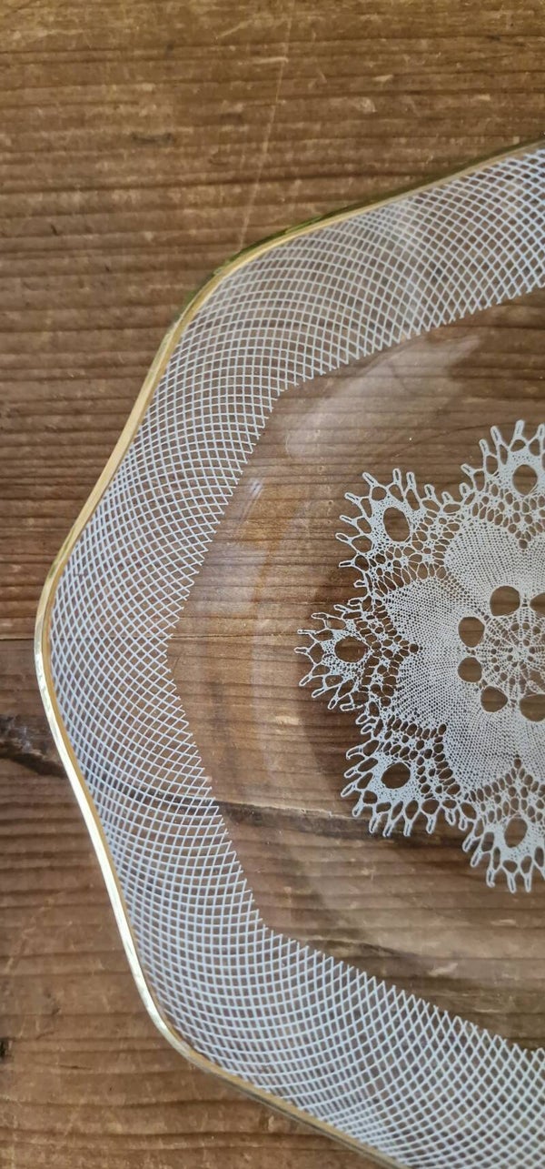Een stel mooie doorschijnende glazen serveerschalen met een opdruk van wit kantwerk en afgewerkt met een gouden rand.