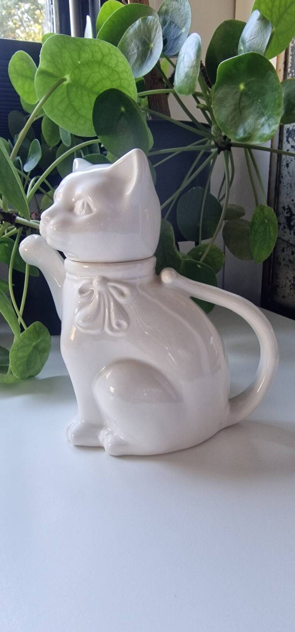 Een ontzettend leuk en lief theepotje is wit keramiek van een katje. Hij is helemaal in het wit met een leuk strikje. Het hoofd is de dop.