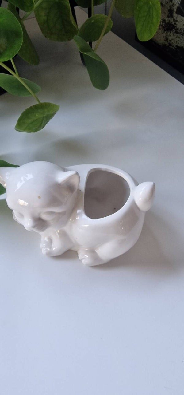 Een lief klein snoezig katje als bloempot, zo lief. Leuk voor een klein plantje of cactusje. Ze heeft een klein vlekje op haar hoofd, niet storend. Verder in goede vintage conditie.