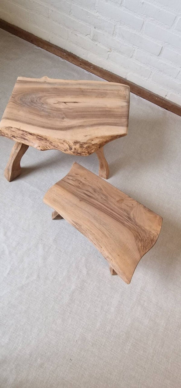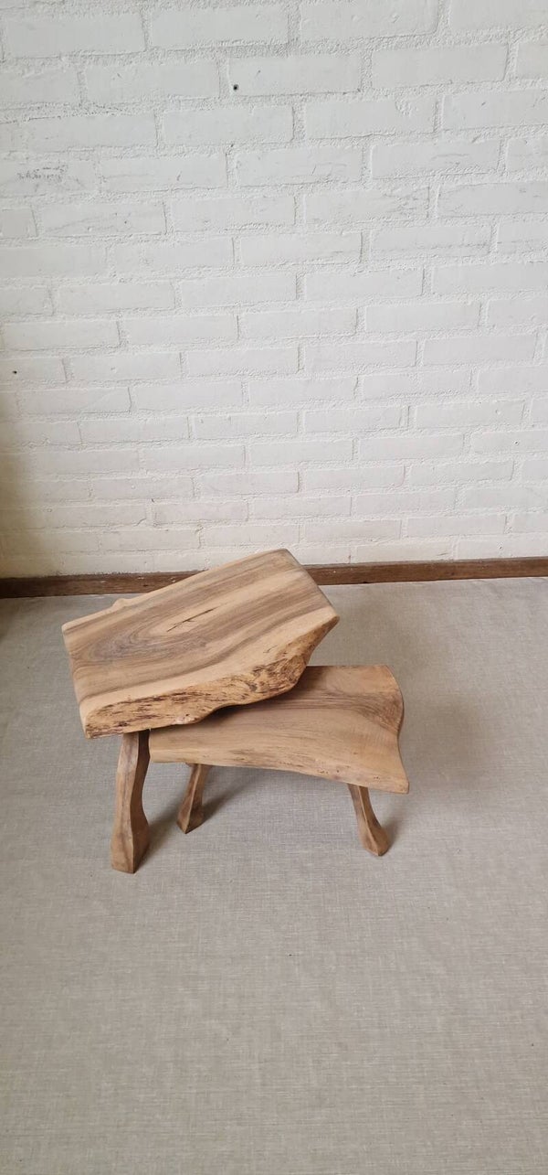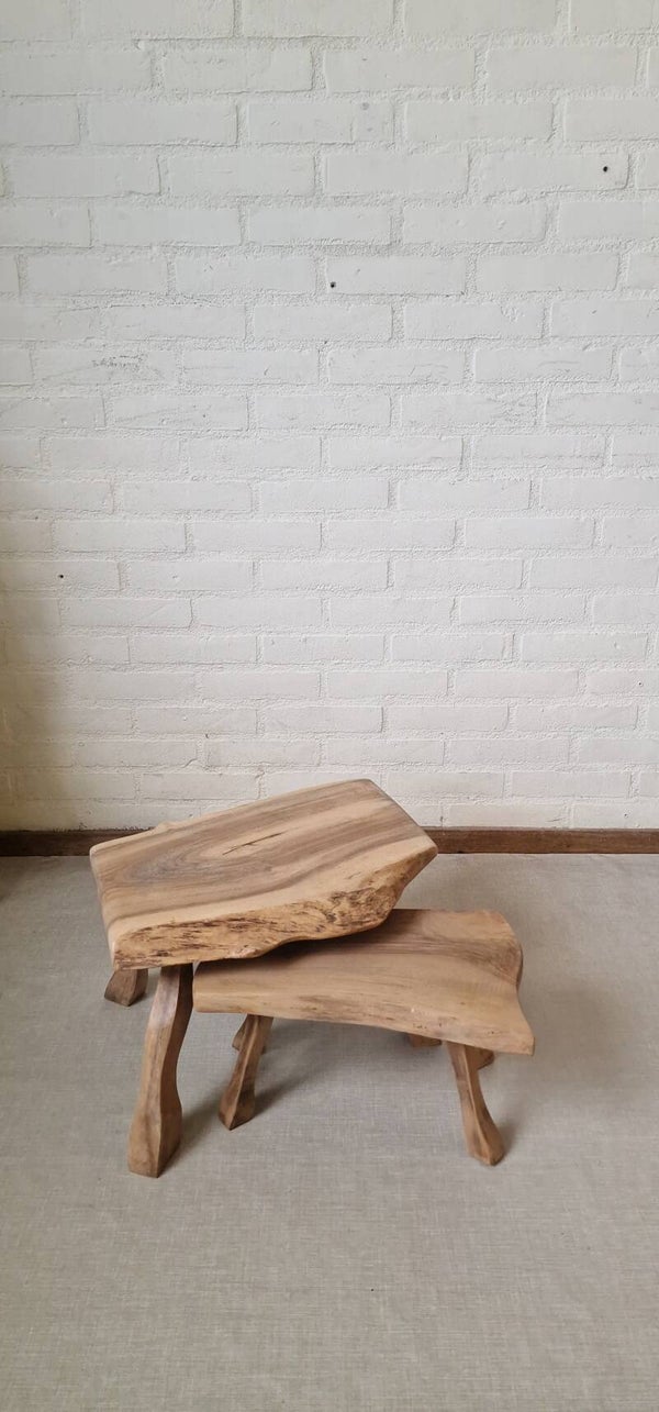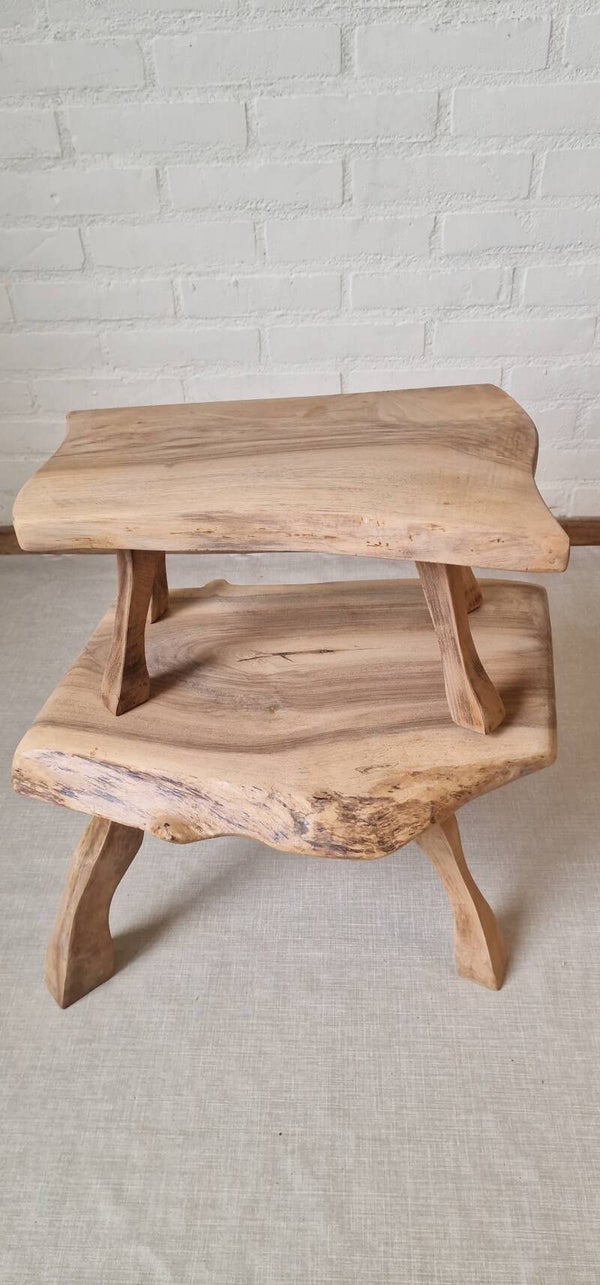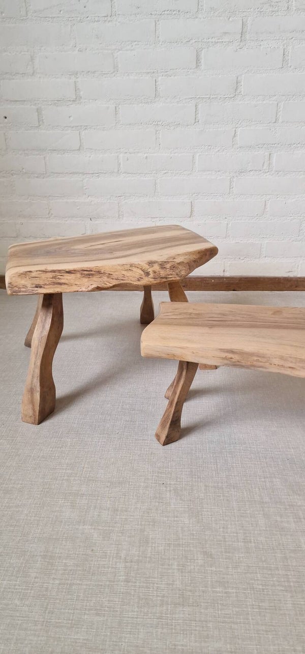 Set van twee mooie handgemaakte houten tafeltjes uit de jaren 60. Dit is echt de perfecte set, de poten, de mooie tekening van het hout op het blad, de vorm. Alles klopt.