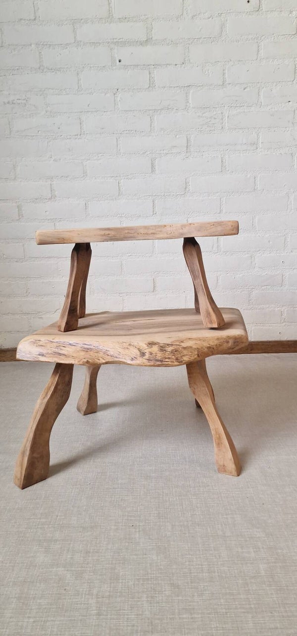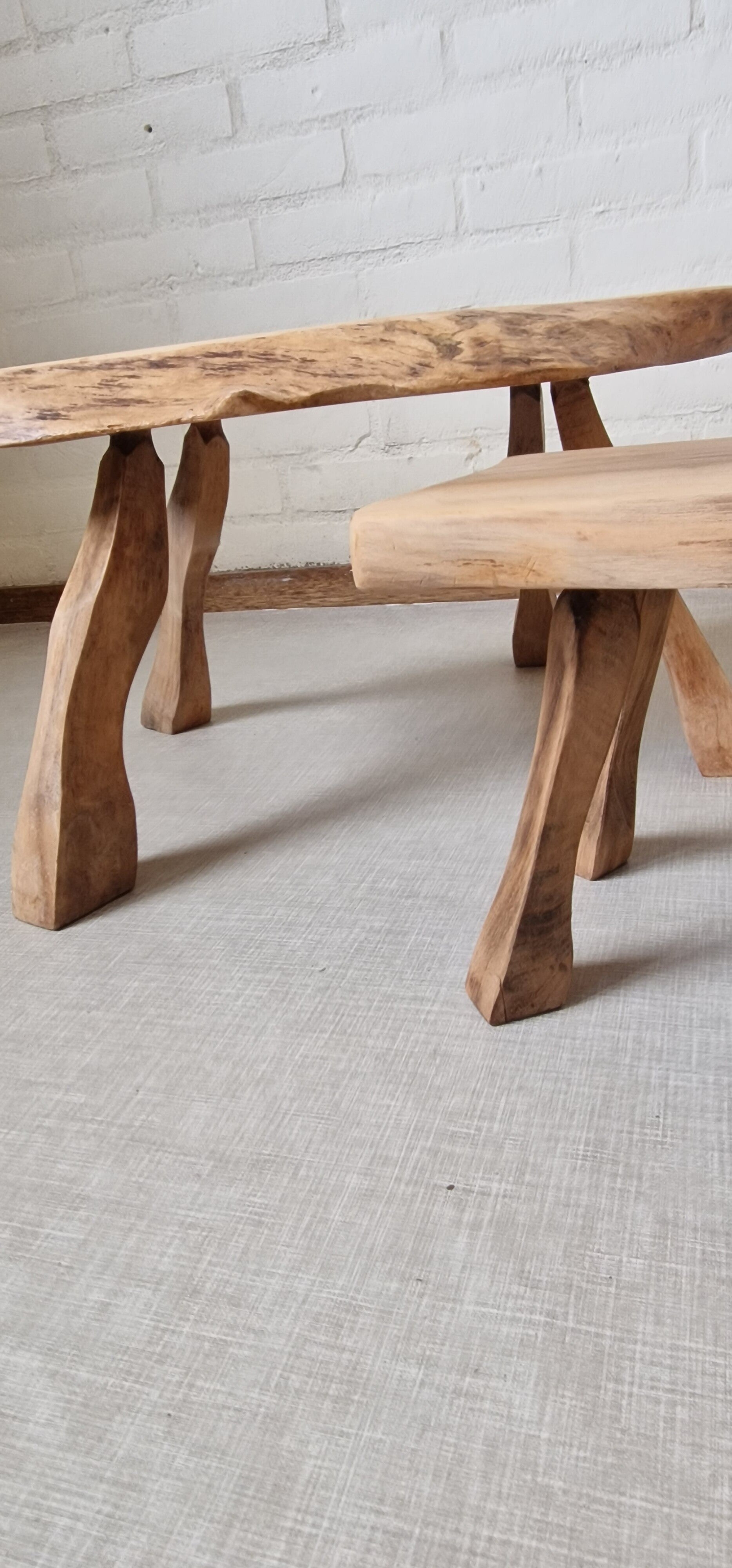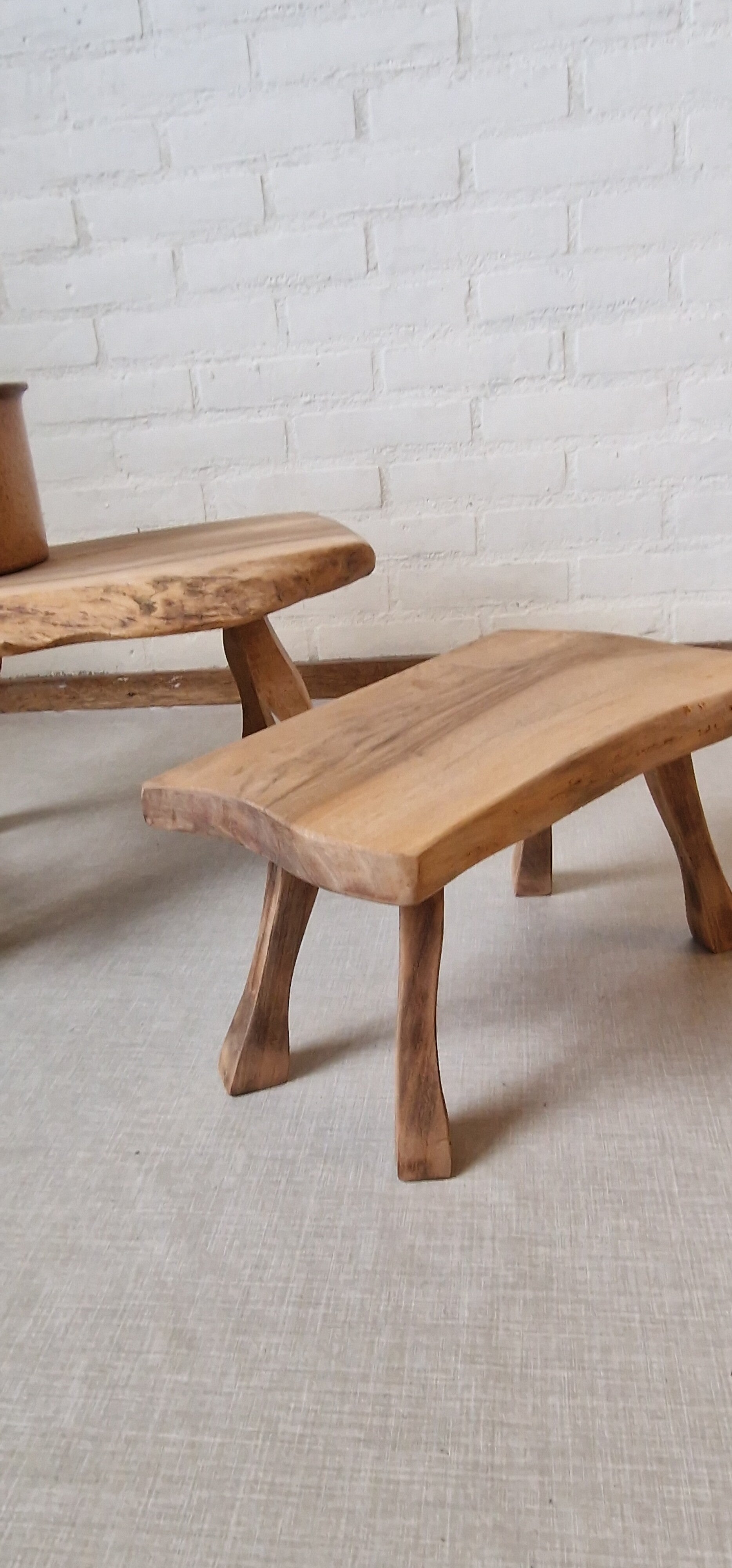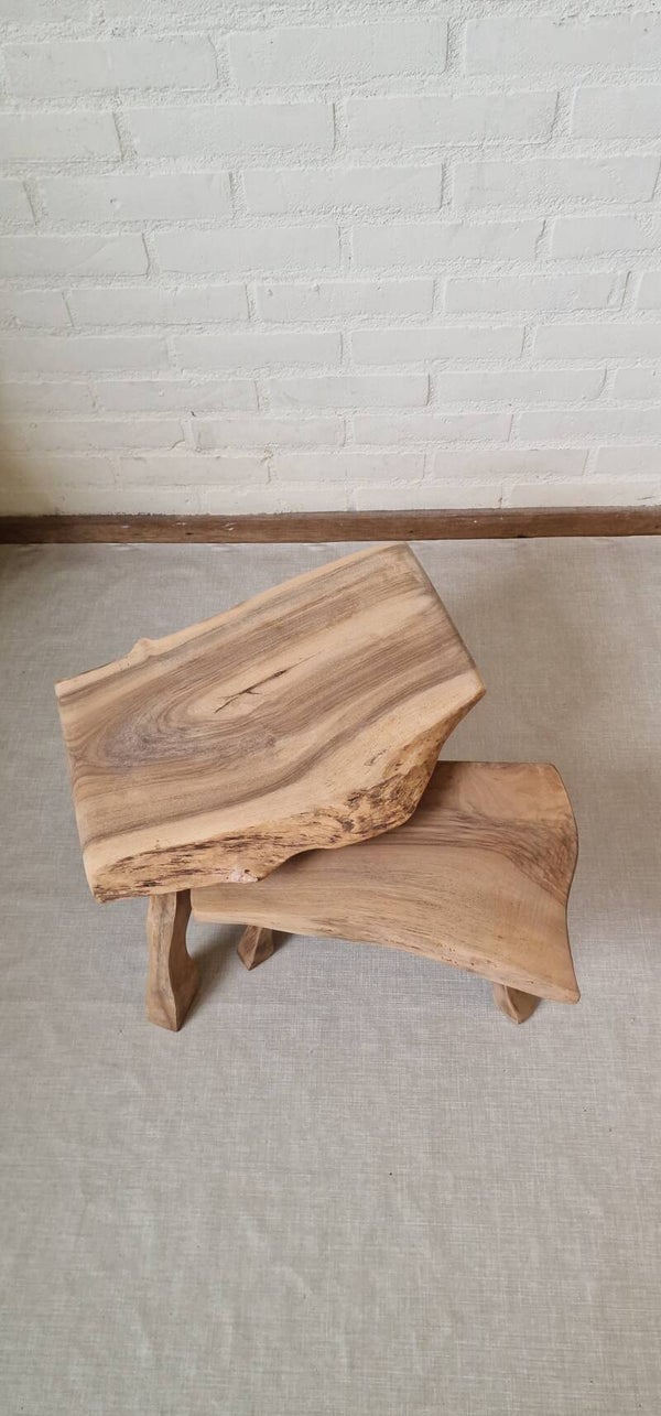 Set van twee mooie handgemaakte houten tafeltjes uit de jaren 60. Dit is echt de perfecte set, de poten, de mooie tekening van het hout op het blad, de vorm. Alles klopt.