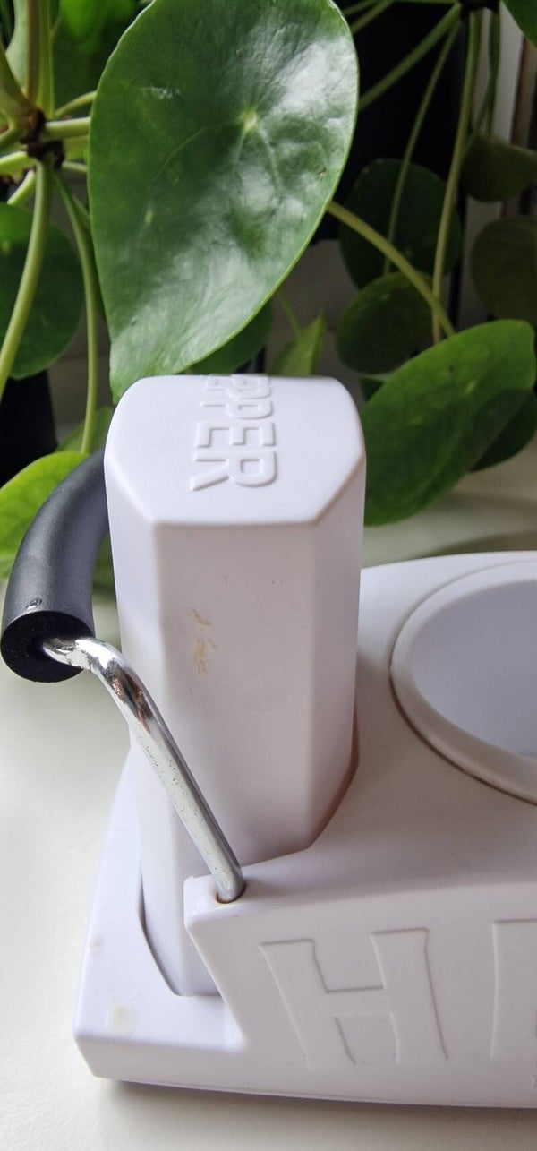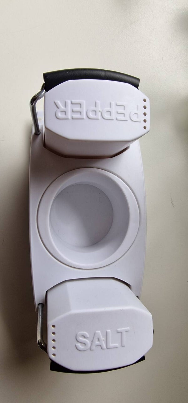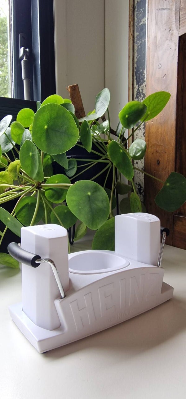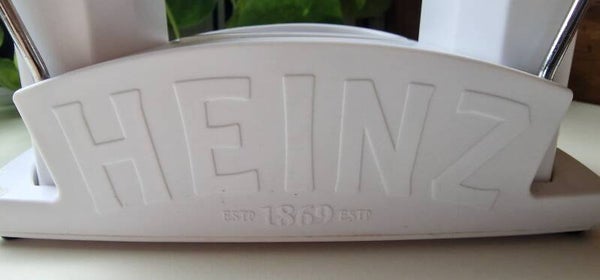 Tafelhouder van het merk HEINZ met peper en zout stel, bekend om zijn lekkere ketchup die in het midden van de houder kan worden geplaatst. De houder is gemaakt van wit kunststof.