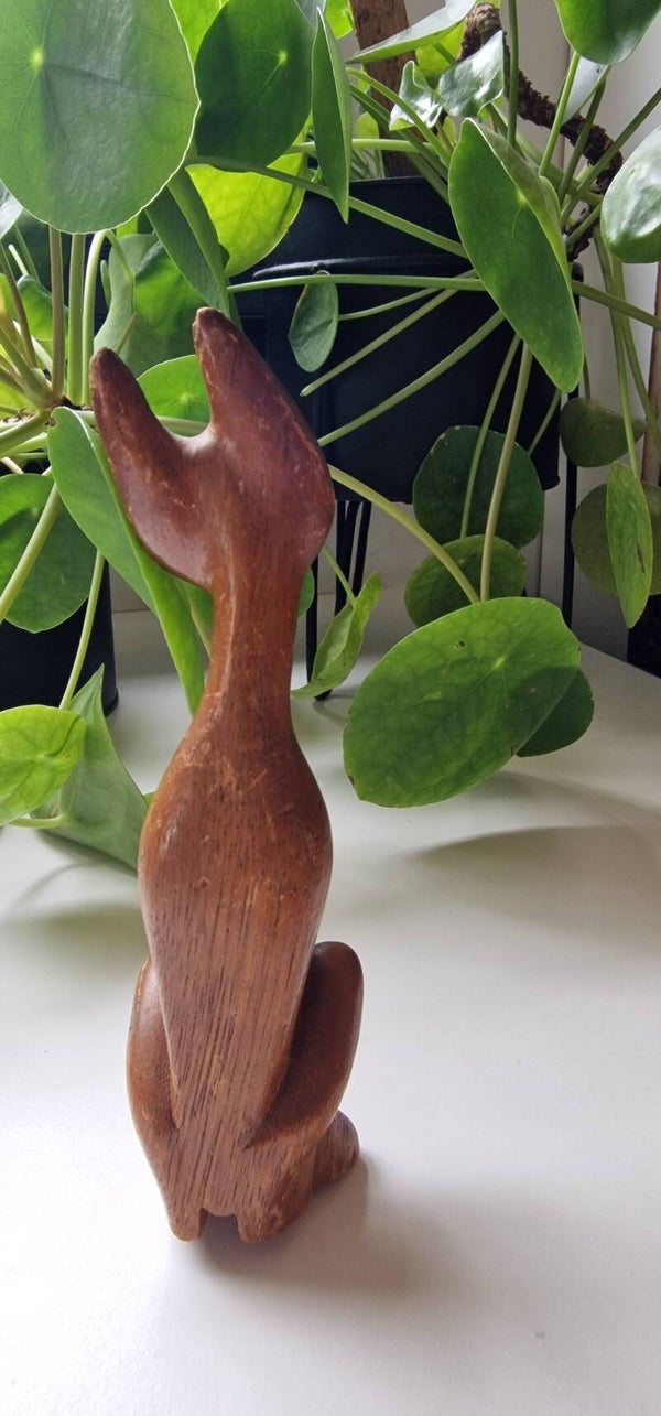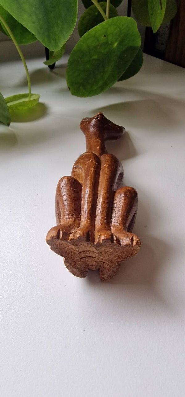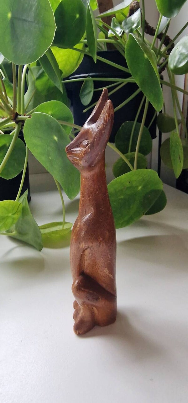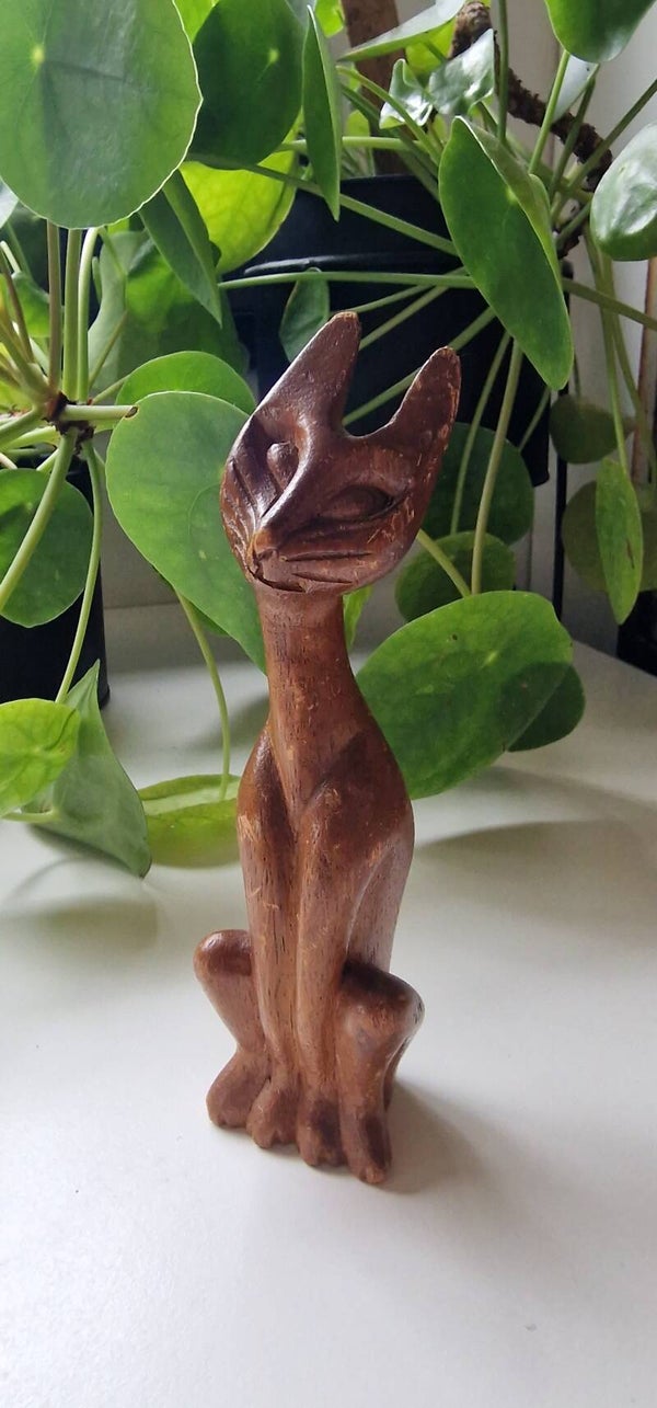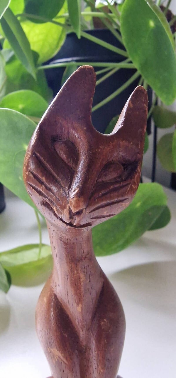Een vintage houten beeldje van een minimalistische kat. Statig door zijn recht opstaande houding en zijn lange nek.