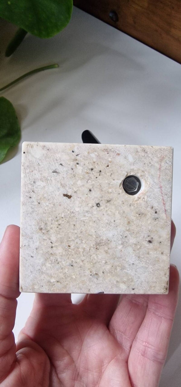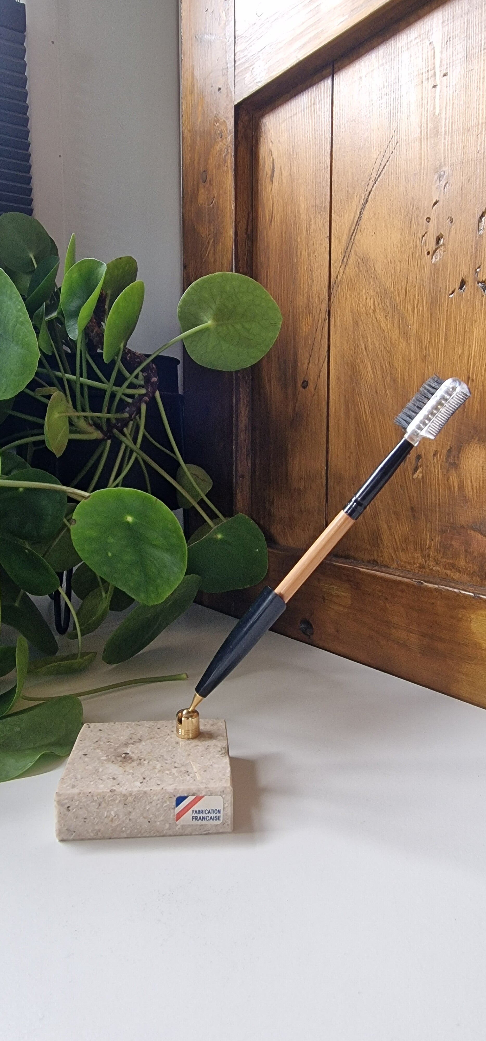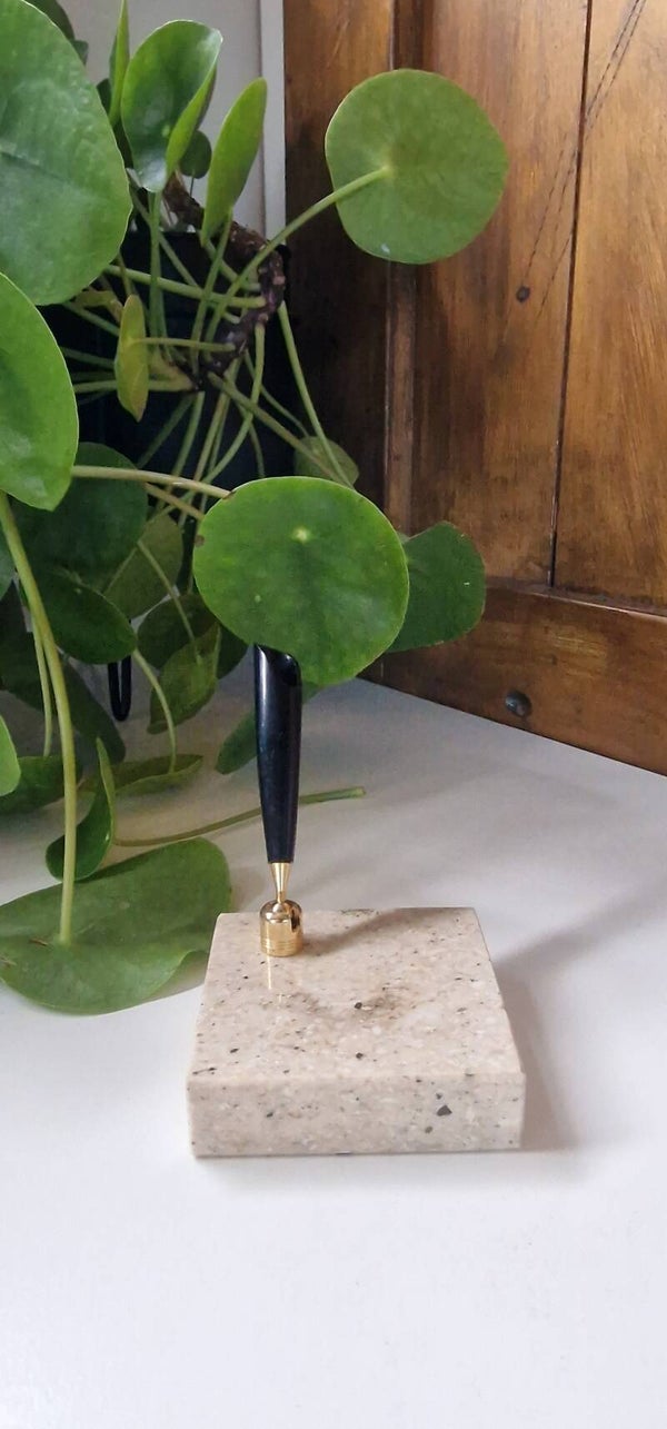 Mooie vintage zwarte penhouder op een voet van onyx / marmer. Komt uit Frankrijk, zie sticker. Leuk op je bureau, maar ook voor bijvoorbeeld oogpotlood leuk om te gebruiken.