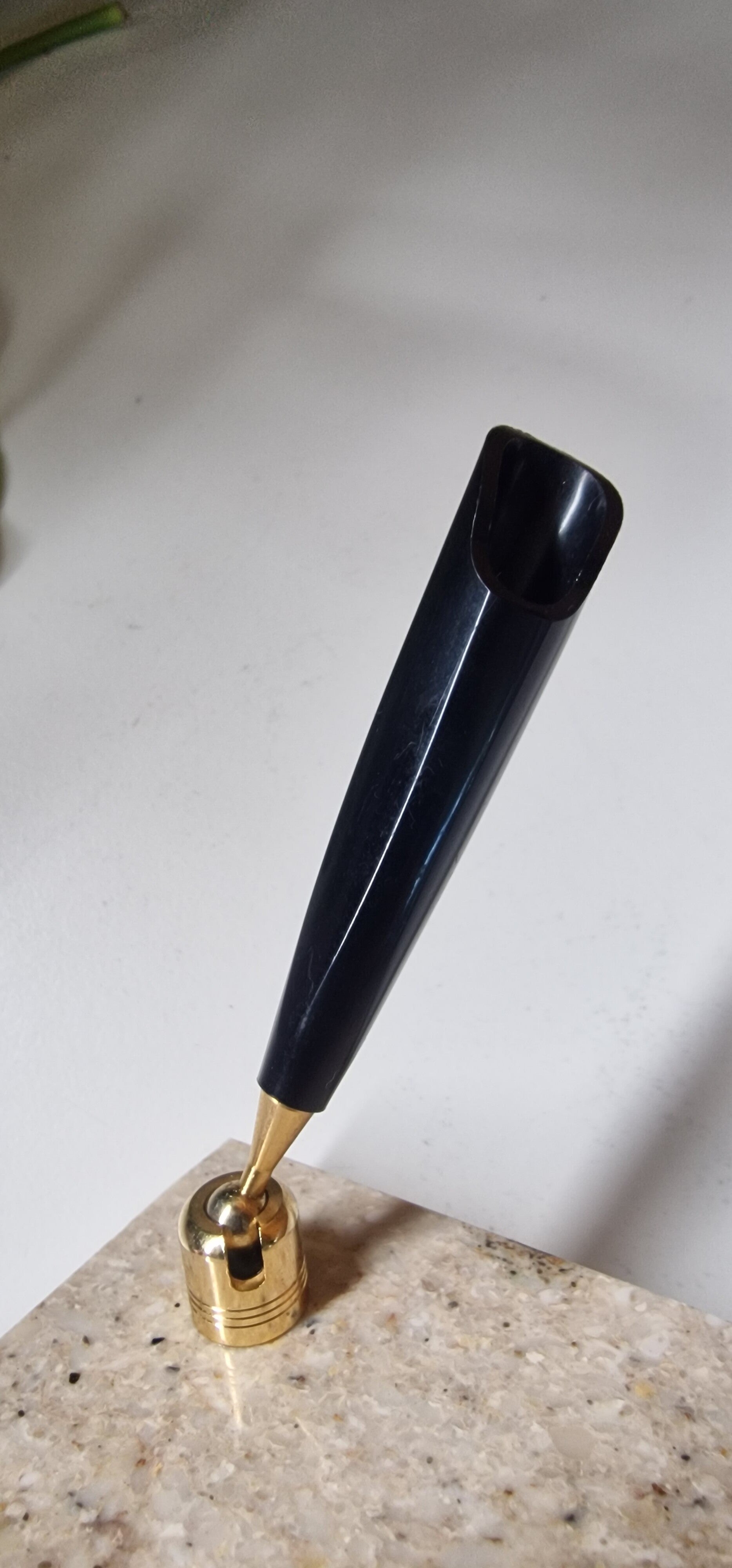 Totale penhouder zwart en messing7 cm hoog. De voet is 7 cm x 7 cm x 2 cm dik.