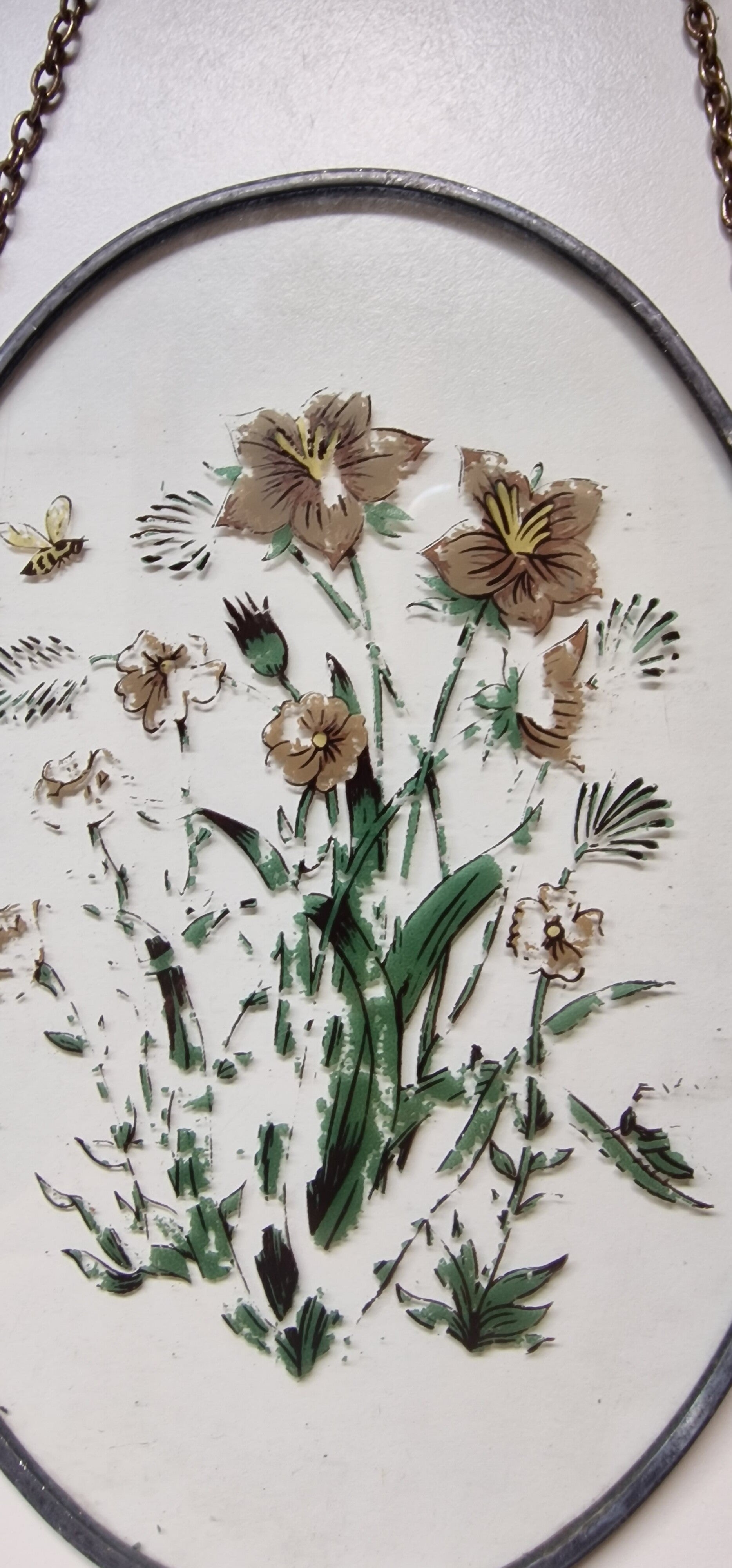 Een prachtige raamhanger van glas-in-lood met een ketting, afbeelding van gele bloemen. Het is geschilderd achter op het glas. Het is nog een wonder dat ze er nog zo uitzien, aangezien door aanraking met water deze bloemetjes niet groeien maar verdwijnen.