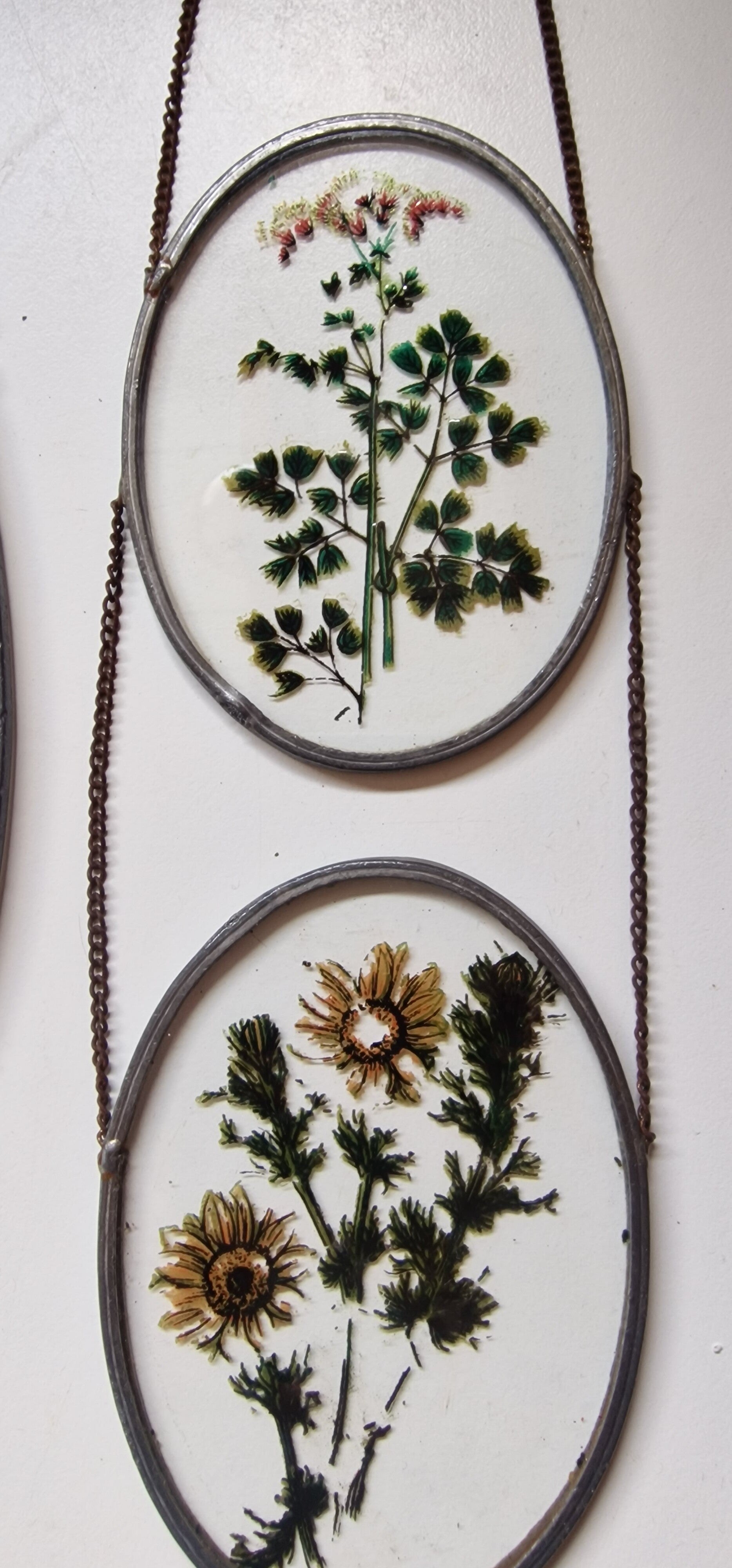 Een prachtige raamhanger van glas-in-lood met een ketting waar twee schilderijtjes onder elkaar hangen met een afbeelding van gele bloemen.