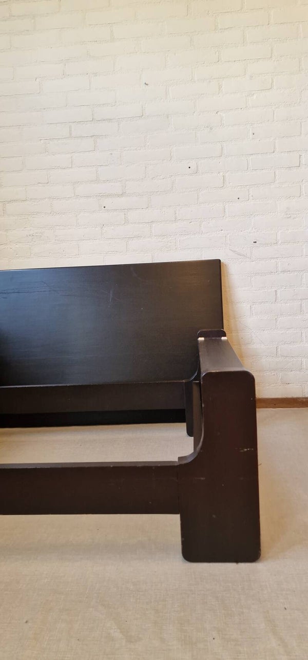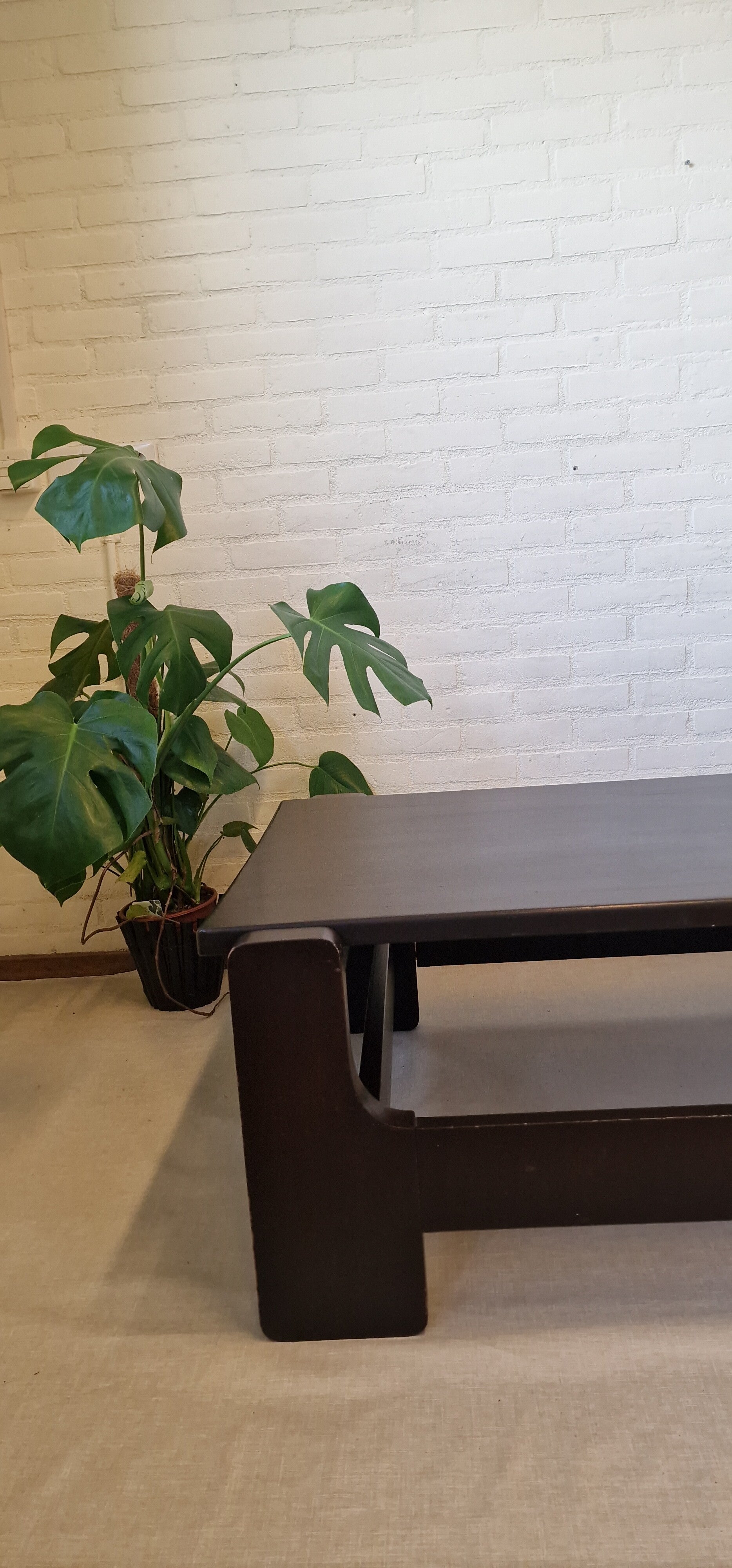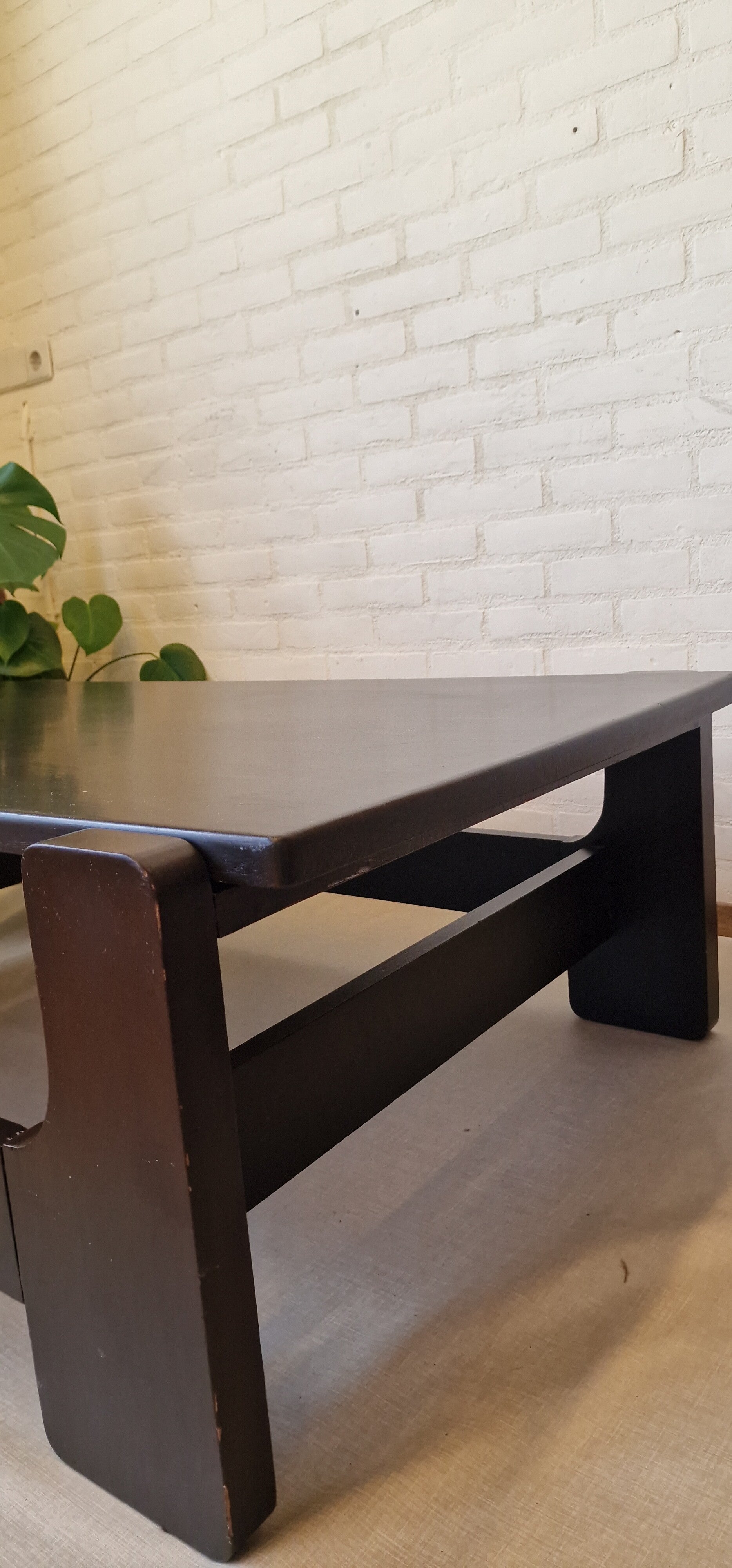 Het ontwerp kenmerkt zich door rechte lijnen en een massieve uitstraling, met subtiele details zoals de uitsparingen in de poten. De tafel is uitgevoerd in donker bruin geschilderd hout.