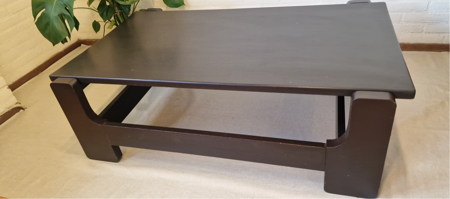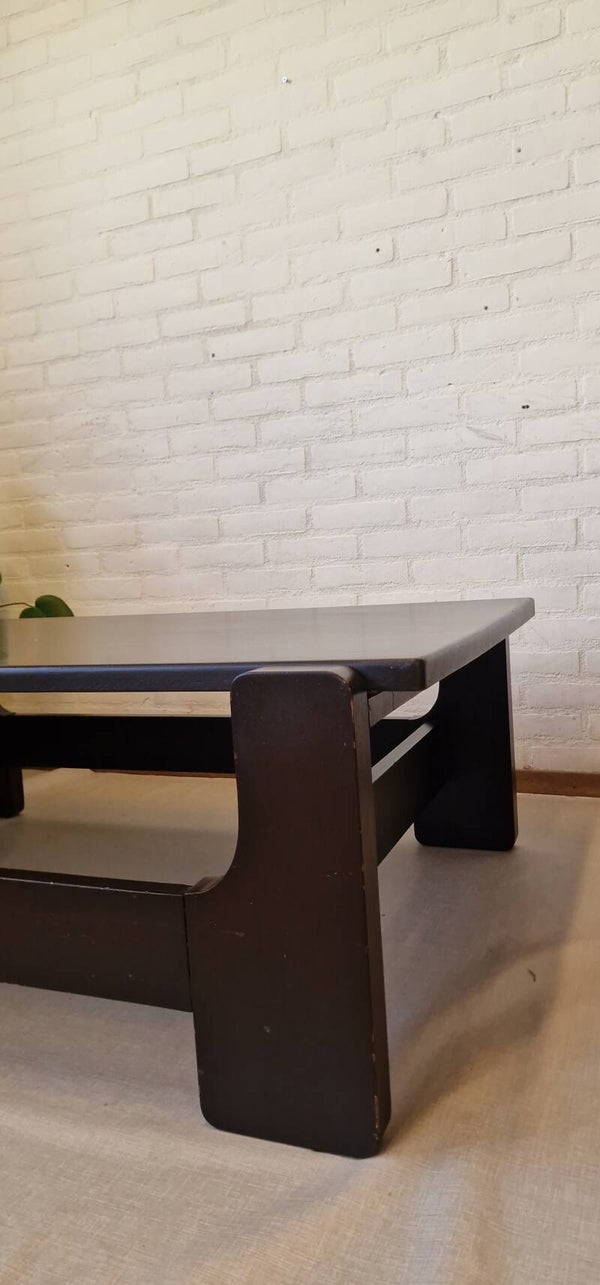Deze prachtige vintage salontafel ademt de stijl van de jaren ’70: robuust, minimalistisch en toch vol karakter.