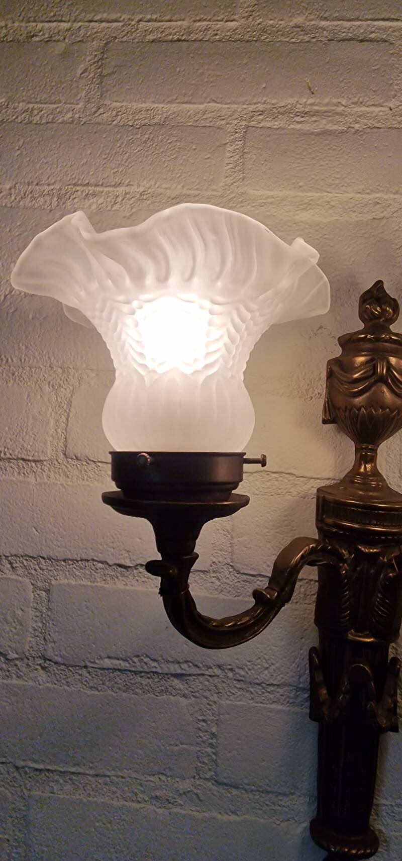 De armaturen zijn uitgevoerd in bronskleurig metaal met sierlijke details en hebben elk twee armen. De glazen kapjes zijn in bloemvorm geslepen/opgeperst glas die een een warm en sfeervol licht geven.